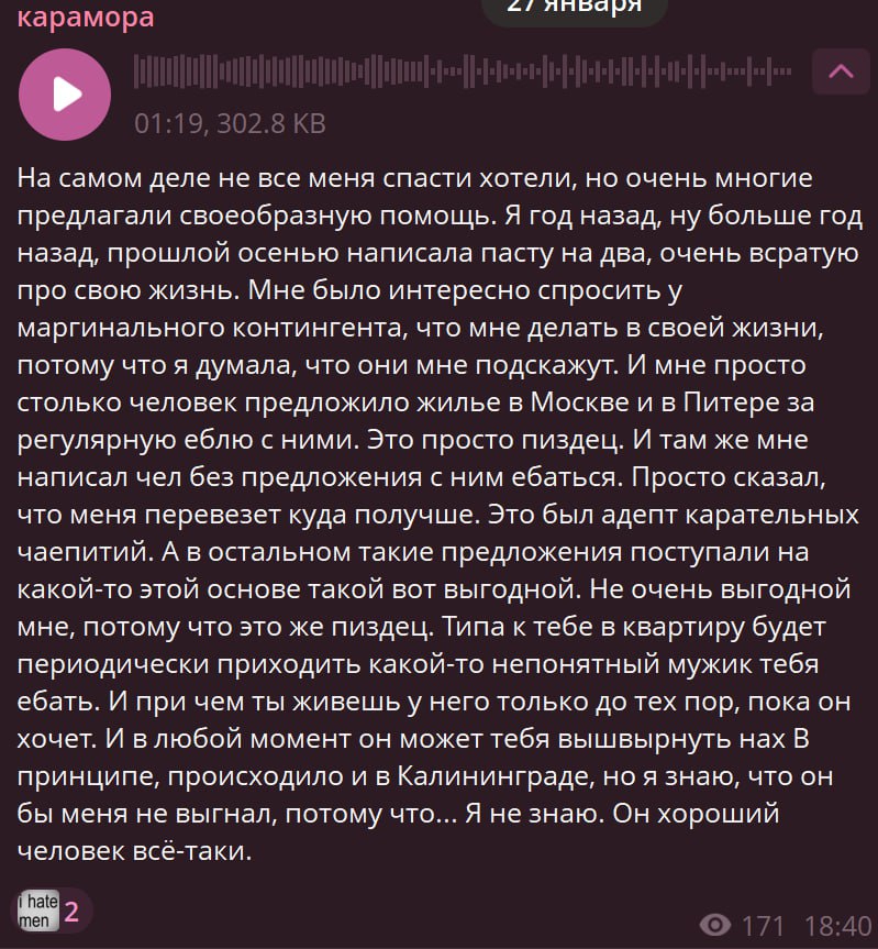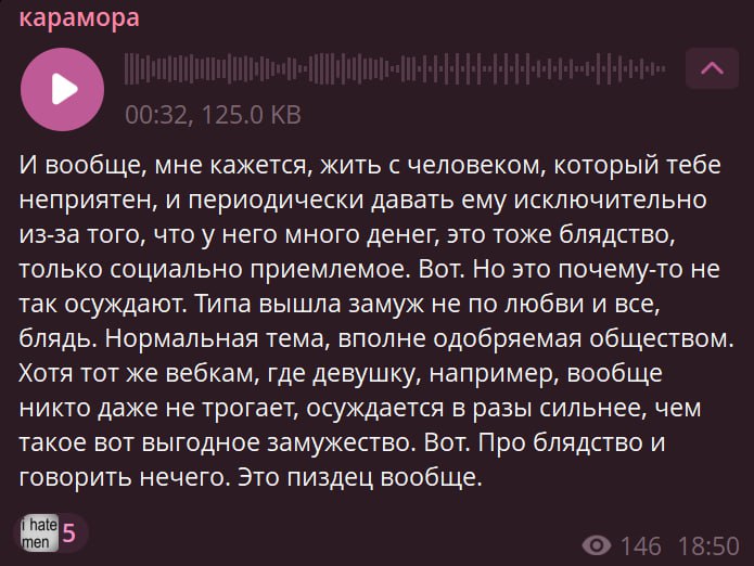 >>6422327 >радфема никогда не осуждает проституток, только клиентов Обычно да. Но не когда проститутки нагло вкидывают "давайте мне 200к на руки и я уйду из проституции". Мне как радфемке жаль тех, кто пытается закрыть долги, выжить, тех кого обманом туда затянули, но Карамориха это тот редкий случай, когда не жаль. Она там из-за страха оказаться нормисом. Она буквально подчеркивает это "я рада оказаться не среди нормисов когда прихожу в вебкам студию", "Я презираю и учу презирать обычных работяг своего брата". " Не надо меня спасать, дайте мне 200к на наркоту" И что мне теперь слепо ее жалеть потому что я феминистка? Написала бы "я оступилась, приняла неверное решение, чувствую вину и апатию, помогите мне". Я бы с ней поговорила, работу даже помогла бы найти. А тут что?