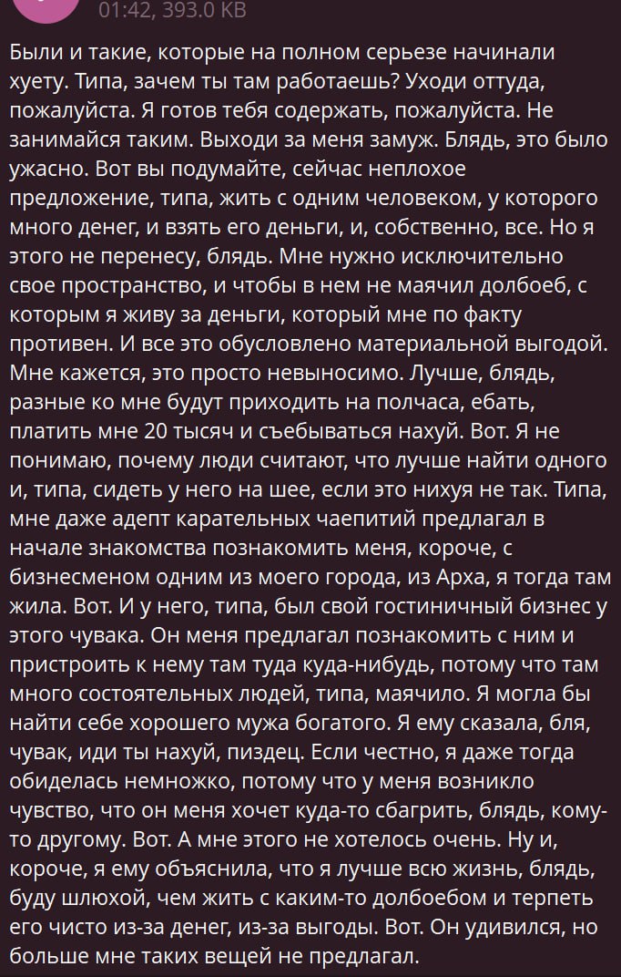 >>6422366 Я бы лучше вышла в окно, чем работала бы в пятерочке, не потому, что я считаю эту работу плохой, или не достойной, я уважаю людей, которые находят в себе силы на это, у меня нет короны на голове, но осознание того, что мне все 12 часов придётся делать то, что я не хочу, убивает, прикладывать усилия, превозмогать это не стоит тех денег, аргумент, что все так живут не работает, я конкретно так жить не хотела бы. Не иронично, завидую тян из Краснодара, которая была на острове у Эпштейна с 14 лет и получила 400 тысяч долларов и карьеру впридачу, я всю жизнь с 10 лет сталкивалась с объективизацией от рандомных мужиков и это было отвратительно и бесплатно, там бы мне за это заплатили и я была бы финансово защищена всю жизнь. Жалею, что проебала тусовки у шейхов в 16 лет, когда меня звал скаут, мне повезло, что меня обеспечивает кун, но его доход меня не устраивает, я очень устала, но понимаю, что это лучший вариант для меня на данный момент,потому что даже работая шл юх ой я не факт, что смогу заработать столько же, сколько зарабатывает кун и проебу семью.
