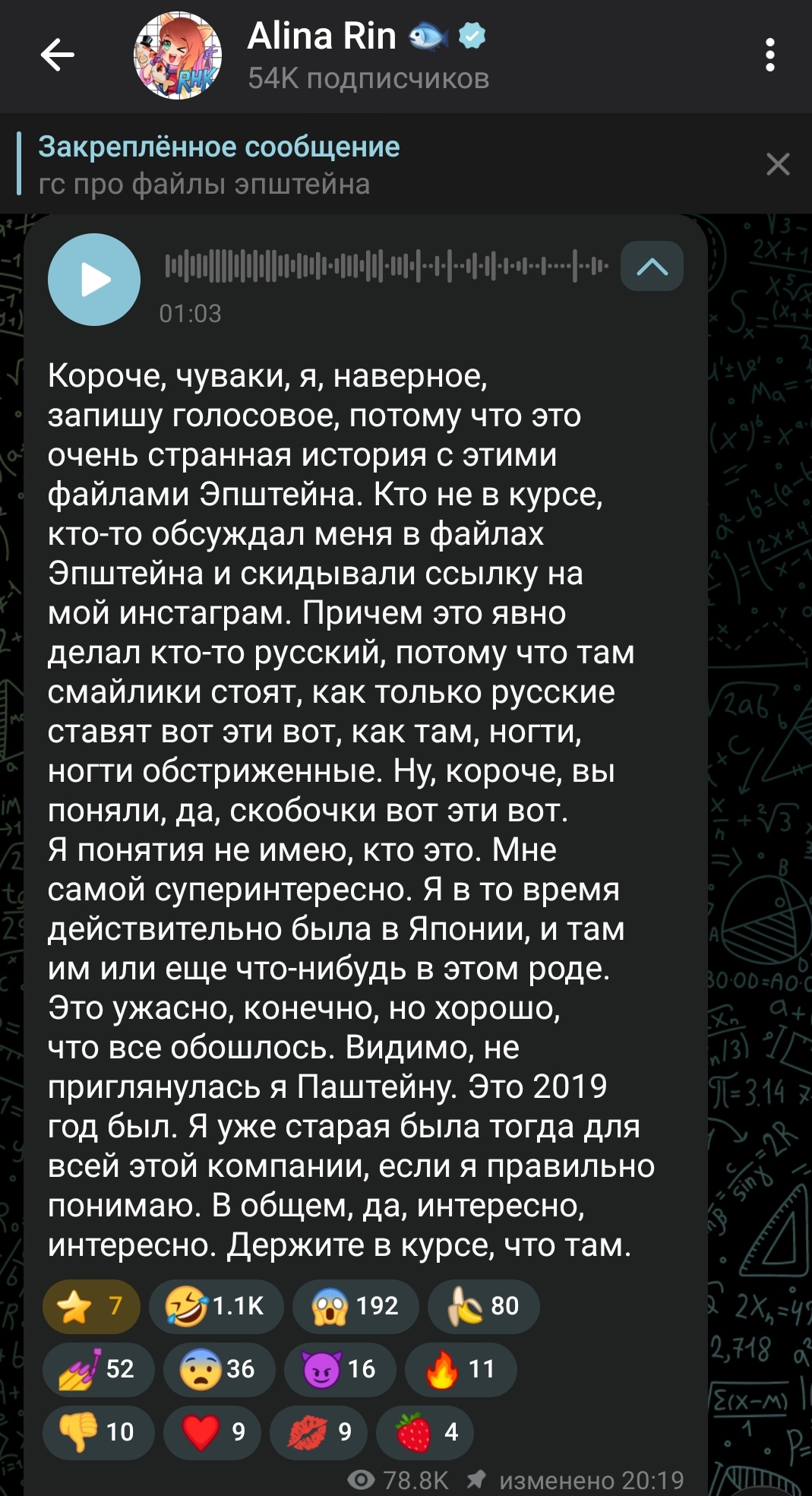 В бэ нашла ⚡ Российская стримерша Alina RinRin фигурирует в переписках Эпштейна - его друг пишет ему о том, что у неё были месячные поэтому она только "ела" сосала и постарается свести их когда она будет в Токио. ⚡Мут создал /pol/ на Форчане в день встречи с Эпштейном. Эпштейн заинтересовался после новостей о возможности манипуляции анонимных форумов на дискурс в интернете ⚡Принцесса Норвегии была берменна ребёнком от Эпштейна??? Её сыну выдвинули обвинения по 38 эпизодам включая изнасилования, начался процесс расследования??? ⚡Принцесса Швеции "веселилась" с Эпштейном в Африке??? ⚡Эпштейн в 2013 году озаботился введением микротранзакций в видеоиграх с целью индоктринации детей в экономику Пиздец какой, принцессы с ним ебались? Как же глубока кроличья нора. Да все эти богатенькие и власть имущие это ебаные извращенцы сектанты. Сало и 120 дней содома
