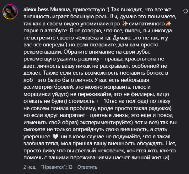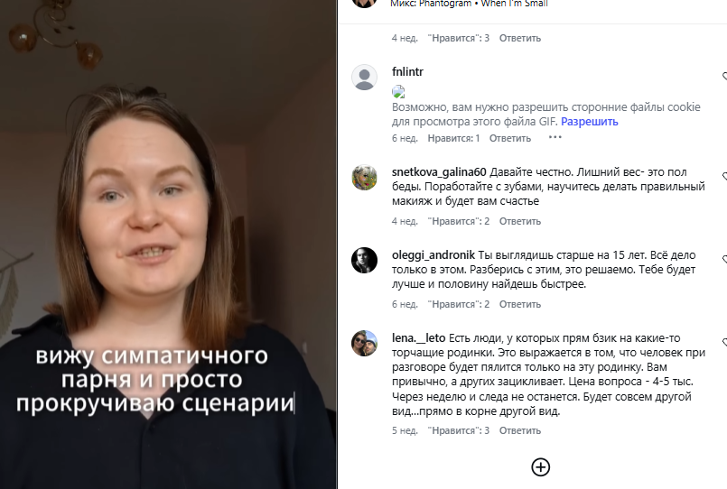 >>6432012 Ладно она рили делулу, хочет симпатичного парня как в романтичных книгах, и что нужно поработать с психологом над уверенностью, а когда ей предлагают удалить родинку отвечает "спасибо за ваше мнение)))".