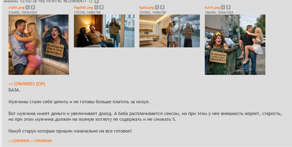 Блядуны, которых весь город трахал и пиздой по хлебалу водил, зарабатывать не умеют, детей рожать и воспитывать не умеют, всратые дегенераты старые собрались искать себе покорную рабыньку и давалку. Нихуя себе.