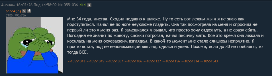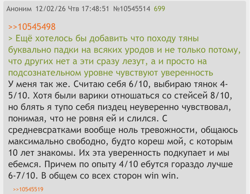>Вам будет проще разойтись до секса. >И еще неоднократно проверено на чушиной логике (что подтверждается чушками сверху), они воспринимают тян, которая им не дает, как приличную. >Но она и есть приличная, если реально ни с кем не спит Это какой-то инцел глубокого залегания тут писюх малолетних пытается воспитывать?