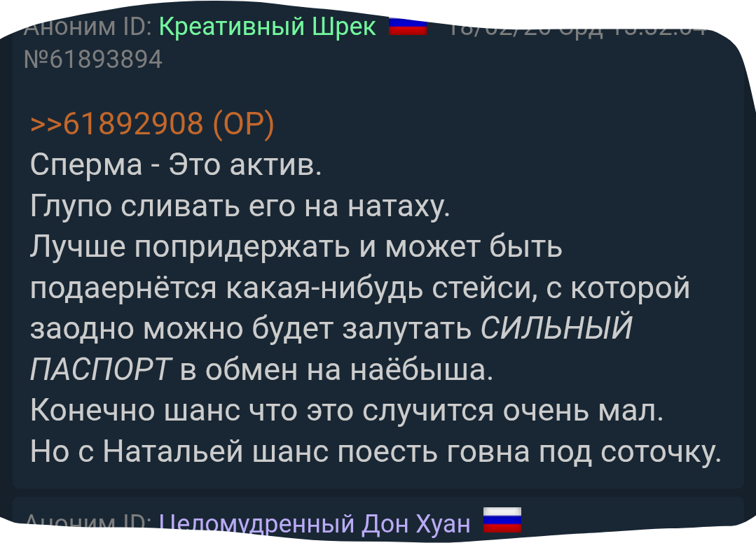 >>6440092 Он просто ахуел. Каждодневный секс — точно такое же элитное потребление. Такая же эгоистичная придурь и хотелка, как сто роз каждый день. Это про потребление и про поставить своих близких раком. Про доминацию и утвердить иерархию, что его желания тут главнее всего. Просто некоторые женщины и мужчины привыкли с мужскими хотелками носиться как с писанной торбой. Истерить, визжать, топать ножками и прочее. И жены их кудахчут - как же так, моему масику не сосали ровно полдня, все, он умирает, еще час и скорую вызывать пора будет. Одинокие мужчины спокойно дрочат и ничего — живы и здоровы. В паре должен быть секс, но история про "каждый день" и мужские истерики - это чисто про то, чтобы жену выдрессировать как собаку на подчинение и показать ей место.