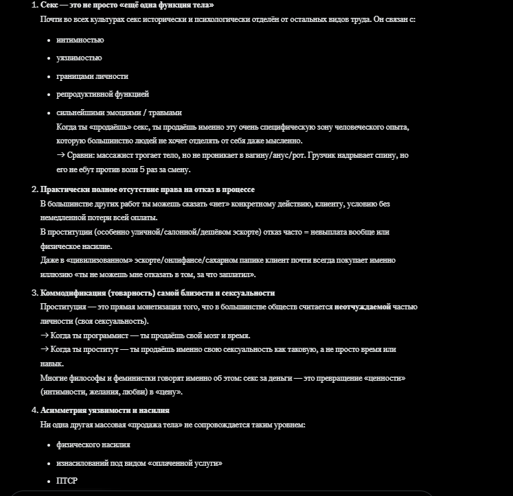 > Нет второй “просто работы”, где услуги тринадцатилетней девочки без опыта стоят дороже услуг двадцатитрёхлетней с десятилетним опытом. > Нет другой “просто работы”, которую невозможно покинуть, потому что работодатель угрожает тебе и твоим близким физической расправой. > Нет другой работы, которую можно выполнить, находясь в бессознательном состоянии. Все это лютый незаконный пиздец. И смысл легализации не в нормализации написанного, а наоборот в предотвращении. Тяжело вести бизнес, когда конкуренты работают законно, а ты нет. Поэтому "черные" сутенеры будут неизбежно вытесняться с рынка, что мы и видим на реальных примерах.