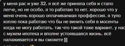 Пж пж не удоляйте((( Неск лет назад сделали тред для ненормисок лохушек, которые хотят как-то вылезать. Мне очень не хватает треда и поддержки сис. Тогда я могла что-то сделать и меня за это похвалили. Да блять, я писала о том, что убралась и помыла голову, и никто не говорил что я чмо, потому что нормальные стейсиуспешносисы, поддерживают чистоту и моют голову каждый день. Я выживаю каждый день на копейки, экономлю на всем, я живу в пгт города мухосранска и тут нет ничего, ни работы, ни дешевой еды, ни перспектив. Я не пробивная кабаниха, чтобы ехать в дс и вкатываться в ойти, я обычная тян и пытаюсь как-то выживать и не сойти с ума. Пожалуйста, кто-нибудь, верните тред, он ме очень помогал верить что все будет хорошо. Что у меня есть друзья. Пожалуйста. Не удаляйте его. Всем сисам кто сидел там лув. Вы тогда помогли мне не выйти в окно, буквально. Тогда я была уже на грани. Алсо, мы не сычухи. Мы хотим нормально жить и изо всех сил пытаемся, просто мы нейроотличные и нам бывает трудно. Но мы стараемся, правда. Все срачи разжигали какие-то ебанашки с крабьим ведром, я помню замечательных сис, которые поддержали меня и сделали много добра. Всем лув, пусть у всех все будет хорошо.