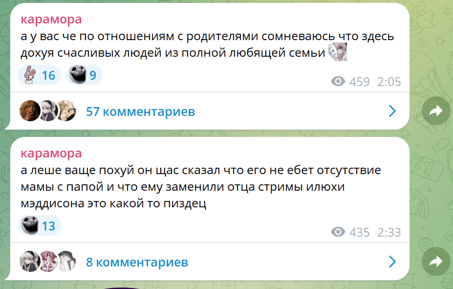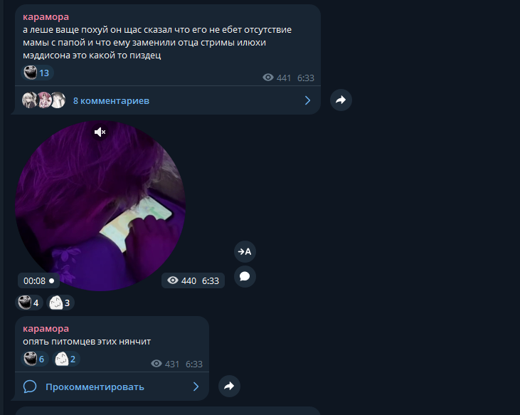 Импотент Михаил и по совместительству куколд 32 лвл всё еще пытается выслужиться перед караморой. наверное после новости о том что она не будет работать пару месяцев он прыгал от счастья и хлопал в ладоши. а вообще стремно, представьте вам 18-19 и вам пишет регулярно комментарии скуфидон с импотенцией, который хочет сместить вашего льошу вампира старого пидораса