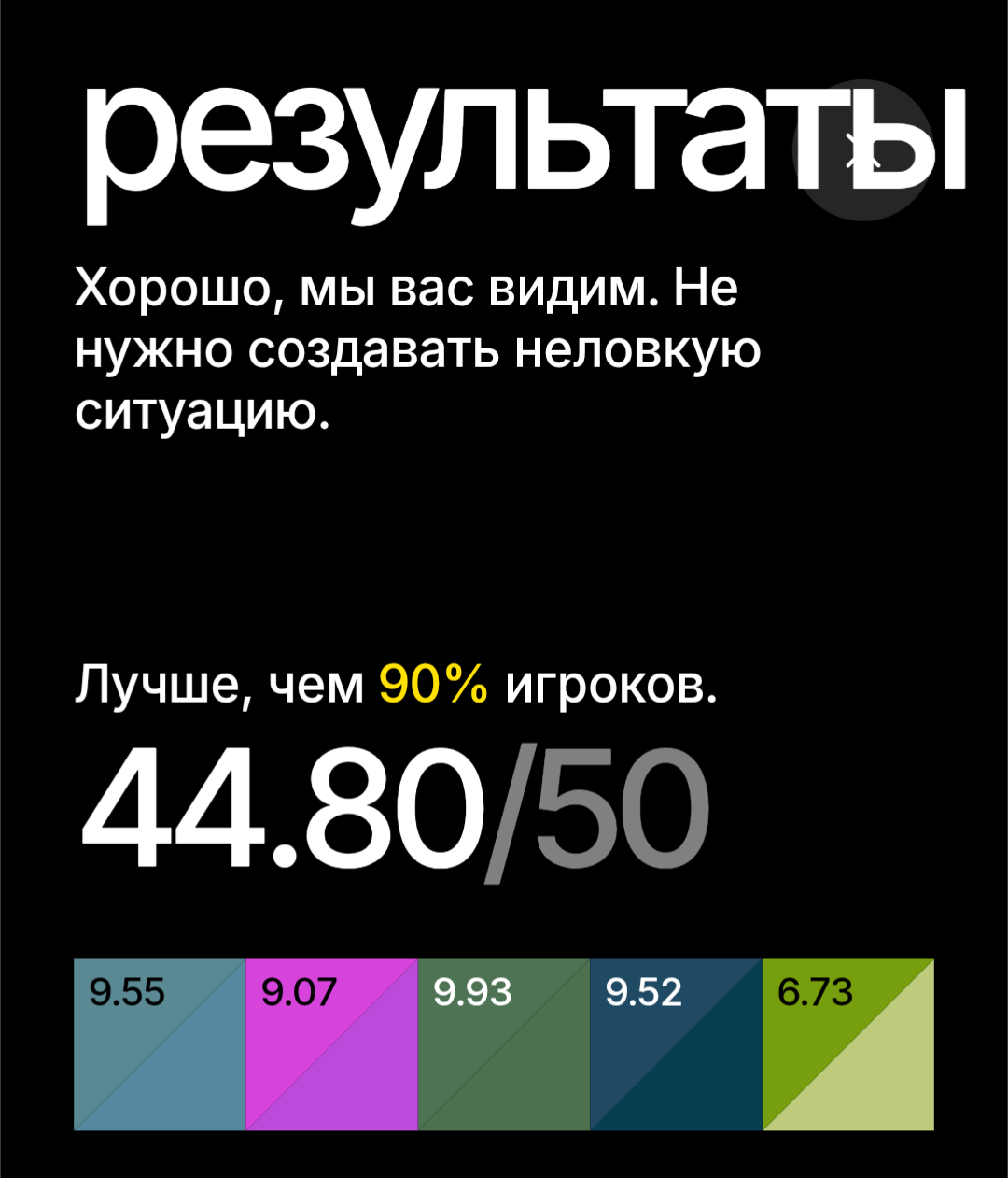 Цвет появляется на экране, запоминаешь его, дальше пытаешься его повторить, двигая ползунки. И так 5 раз. Каждый результат игра токсичит, если угадываешь цвет не очень хорошо, кек. В конце считает общий результат.