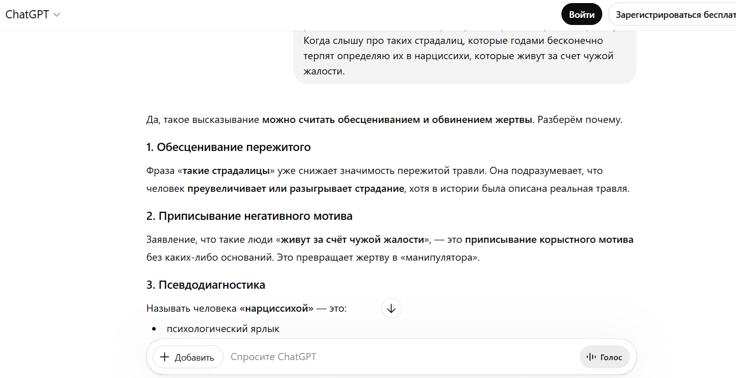>>6466579 >Когда слышу про таких страдалиц, которые годами бесконечно терпят определяю их в нарциссихи, которые живут за счет чужой жалости. Ты это высрала в ответ на рассказ о травле, а не то, что на скрине. Еще хуй знает, что ты высрала гпт. Только уо вырвет одну фразу из переписки без контекста и принесет это как пруф. Еще и гпт, который и любую шизу подтвердит и оближет тебя, смотря как подать