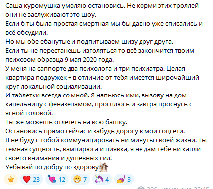 она всегда осуждала терапию и не верила в неё все походы к терапевту были тем что настояла я как к личному так и к семейному на всё это она всегда закатывала глаза и с скрипом в зубах шла на сессии я могла быть в путешествии в другой стране и она требовала от меня чтобы я говорила с ней по телефону по 2-4 часа пока она плачет мне в трубку и говорит что хочет убить себя а на любые слова поддержки или попытки хоть что-то сказать она отвечала «да бля так кто угодно может сказать ты даже поддержать меня нормально не можешь» если я пыталась взять дистанцию и просила о том что «давай созваниваться раз в пару тройку дней я хочу хорошо провести время тут» она обзывала меня эгоисткой или нарцисской и психопаткой(кстати был момент когда она пыталась убедить меня в том что я такая – я отнесла это на терапию и моя терапевтка засмеялась от абсурдности этого предположения) она портила мне малейший шанс на счастливое время где бы я не была в какой стране бы я не была в целом в наших отношениях обзывательства с её стороны были условной нормой я даже пару раз выставляла сториз скринов ее сообщений как она меня обзывает и тэгала её (горжусь по сей день этим)