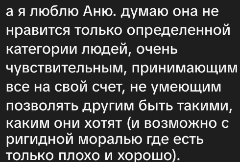 5)друзья она дружила с людьми с которыми ей выгодно дружить лизала жопу там где ей выгодно хавала говно от других популярных людей чтобы они оставались где-то рядом и мооожет быть репостнули её новый трек а дома мне поливала грязью всех этих людей улыбаясь им лично я человек противоположного склада и я не переношу фейковость и неискренность во всех её проявлениях я очень быстро увидела то что все эти люди это не её друзья а просто выгодная ей шелуха вокруг на мой вопрос когда она последний раз говорила с друзьями по душам она была в ступоре и я не смеялась над этим я думала ебать какая же это хуевая ситуация по жизни и наверное как ебливо внутри ощущается быть такой мне было очень тяжело быть для неё всем и я всегда мечтала чтобы у неё появились какие-то люди вокруг кроме меня чтобы нагрузка с меня уменьшилась отсюда выходит следующий пункт