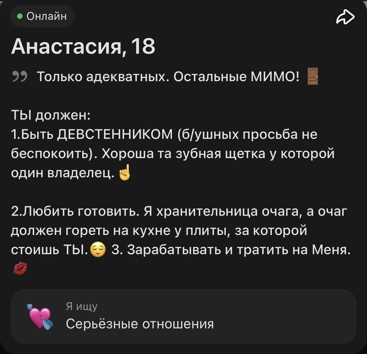 я не хочу никак быть ассоциированной с ней моя главная мотивация писать это не лайки не реакции и не залетевшие видео в тиктоке или в рилсах (я намеренно не снимаю это) а чтобы свершился страшный суд и чтобы с настей гречкой после моих слов не стала встречаться ни одна девушка в здравом разуме ради своего же блага