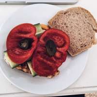 Ну что ж, буду первым со снедью в новом треде.Сэндвич с куриной грудкой, козьим сыром, оливковой пастой и овощами.