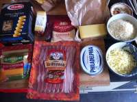 Дано: фусилли букати, молоко, мука, масло, грюйер, конте, чеддер, моцарелла, филадельфия, панко, тирольский беконИтого: мак-н-чиз
