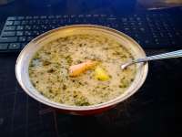 Борщ на останках индейской ноги пущенной на фарш, с красной фасолью и укропом. Собственноручно изготовленная ким-чи (все больше и больше нравится, где-то вторая неделя ферментации), собственноручно засоленная свиная грудинка, треугольный хлеб на закваске из местной пекарни.