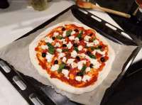 >Тесто: Для одной пиццы - ~200 мл тёплой воды, 300 г муки, половина чайной ложки соли, чайная ложка дрожжей или полпакетика (25 г., пример Доктор Oetker, Саф Момент и т.п.).