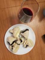 Хинкали покупные с сулугуни и кинзой. Жутко солёные, не рекомендую. Впрочем под вино с голоду норм. Потом заедал арбузами: запах супер, а вкус... ну вы понели. Что за жизнь(