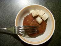 Слегка обжаренный картофель с формованными биточками в советском стиле, выложенный рядом с релишем из маринованных корнишонов и дижонской горчицы. Экзотическая вилка а'ля рюсс открывает возможности небрежно разбросанного рядом кошачьего корма.