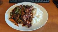 >>639384 Расскажу из чего приготовлено: Лук белый репка, чеснок, имбирь, перец желтый, перец красный, пекинская капуста, сельдерей, куриное филе, тофу, соус хойсин, соус устричный, чили порошок, сахар, терияки, хуацзе, крахмал рисовый. Как ни крути, вок на плите из стекла такое себе. Сначала отжарил курицу - отложил, потом тофу - отложил, потом имбирь и чеснок довел до аромата и вкинул в них овощи, потом замиксовал всю палитру в как-бы воке, перемешал много раз на большом огне, добавил соус хойсин, устричный соус, чили, хуацзе, терияки. Перемешал много раз три минуты. Все. Готово.