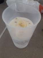 В обед съел кашу и грудки, приготовленные мной вчера и заранее расфасованные по грааммам в коробки. Только что взбил блендером творог, мюсли, банан и молоко, чуть изменив пропорции, вышло густо и прикольно.
