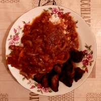 перетираешь каклетку, кладёшь в сковородку, добавляешь туда томатной пасты и водички, чуть протушиваешь, потом добавляешь отвареные макарошки, сверху листик петрушки можно незаметно спиздить на базаре чтоб не покупать целый пучок - и вот у тебя уже ле баланьезе классик, а не нищие макароны с коклетой