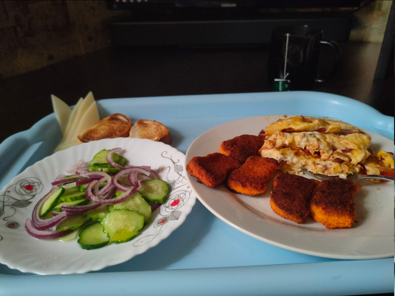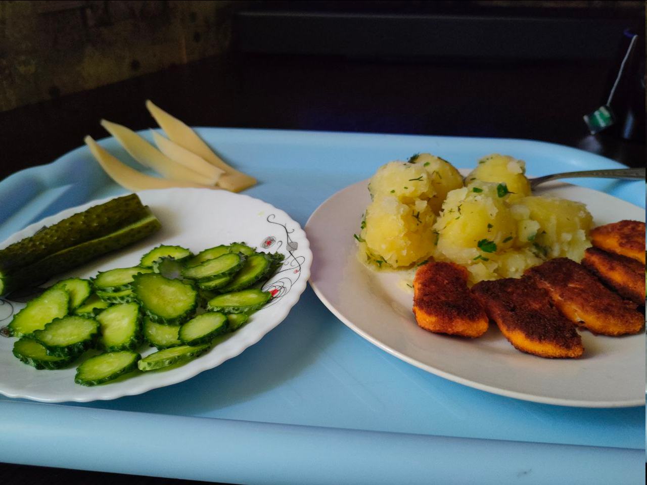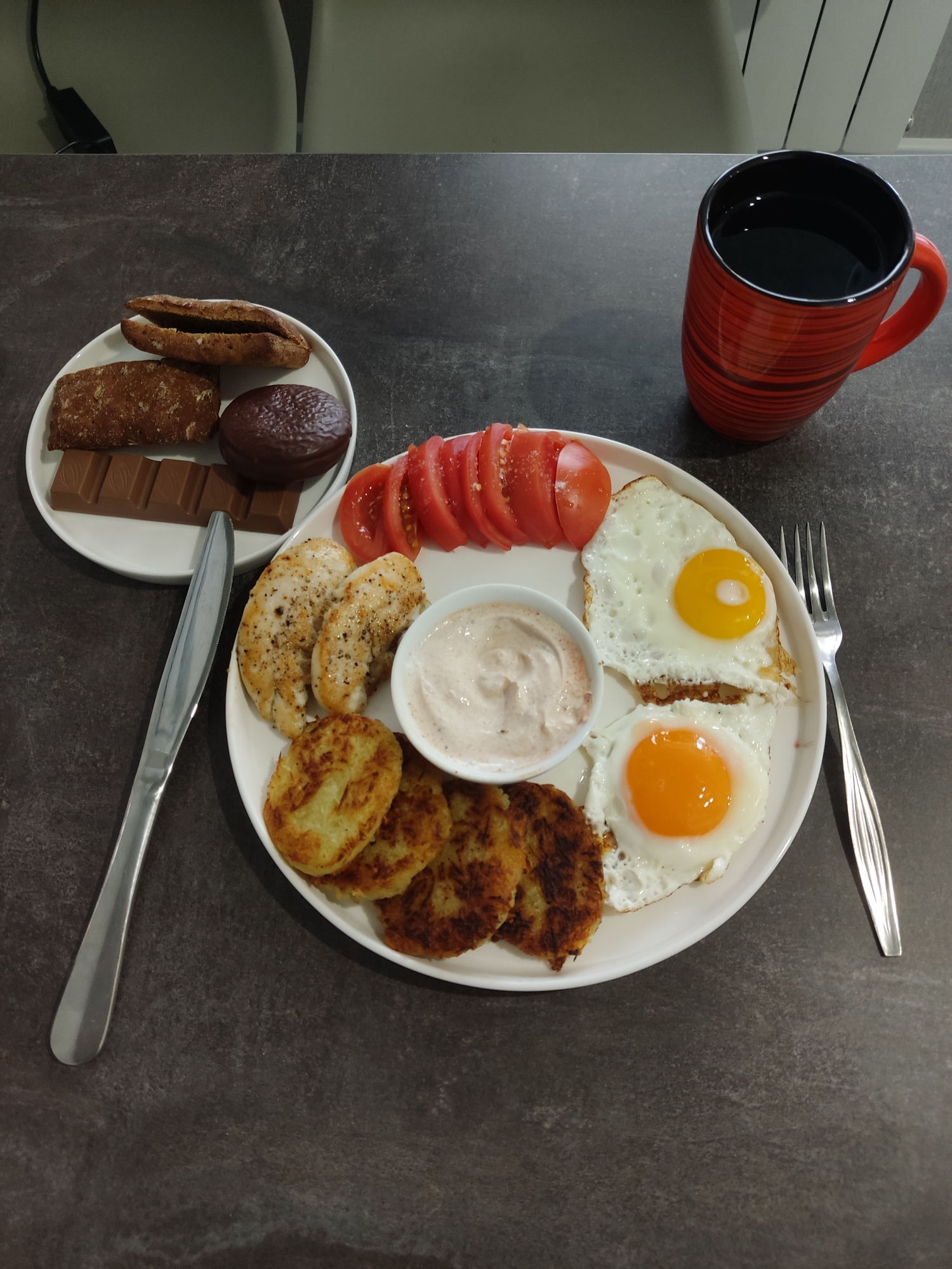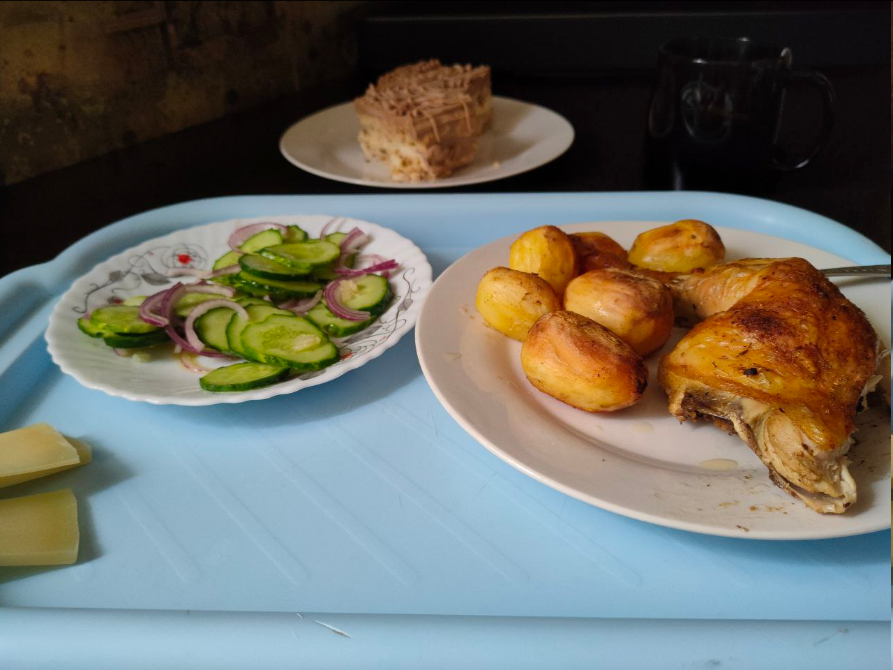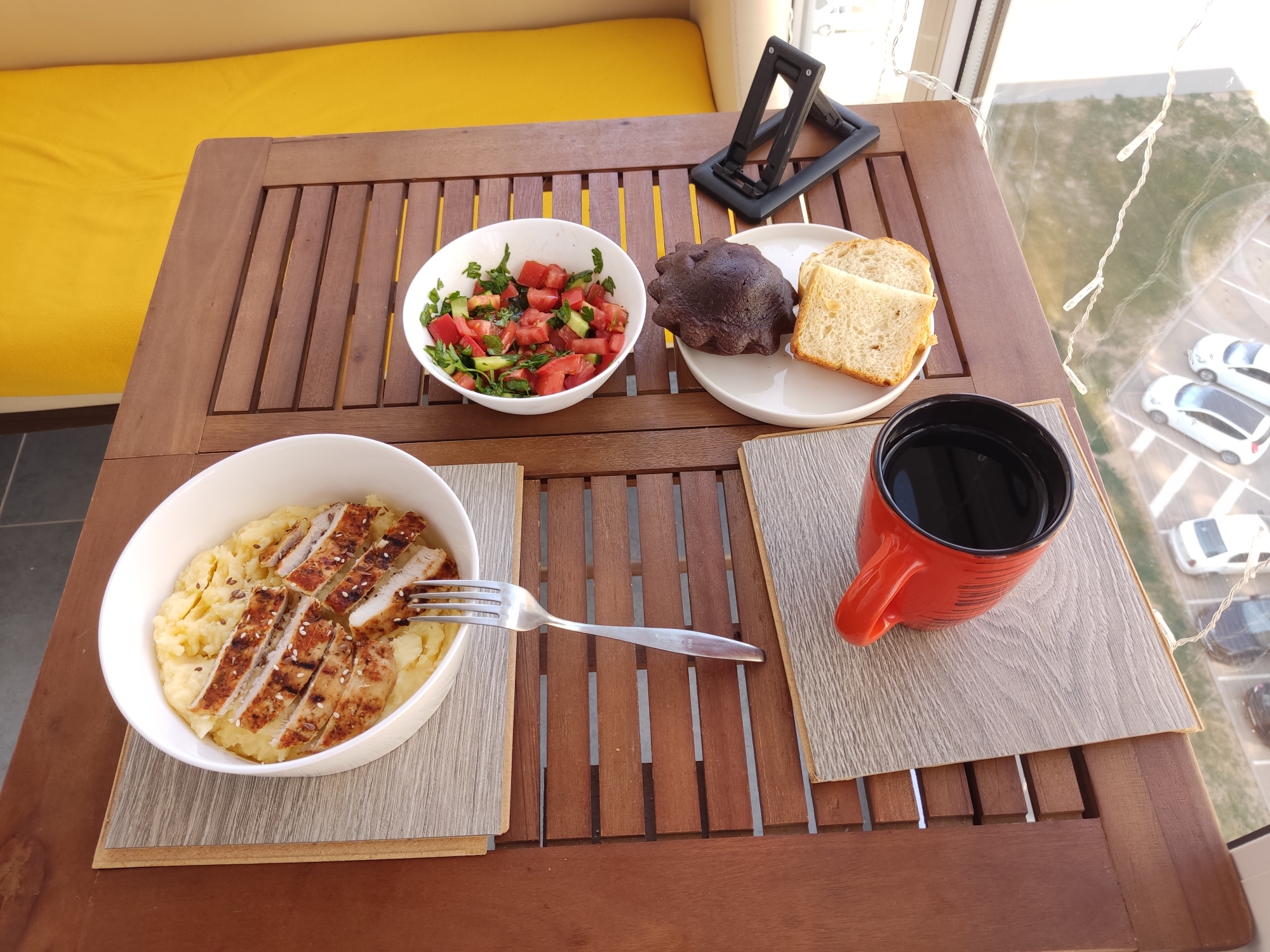 Вторая половина утренней куросиськи, картопля, салатик в этот раз без лука и картофельный хлеб, дабы было что в жижку макать
