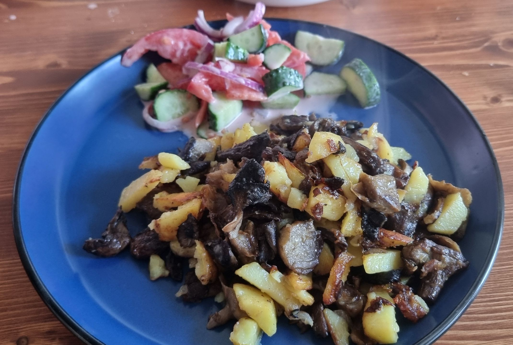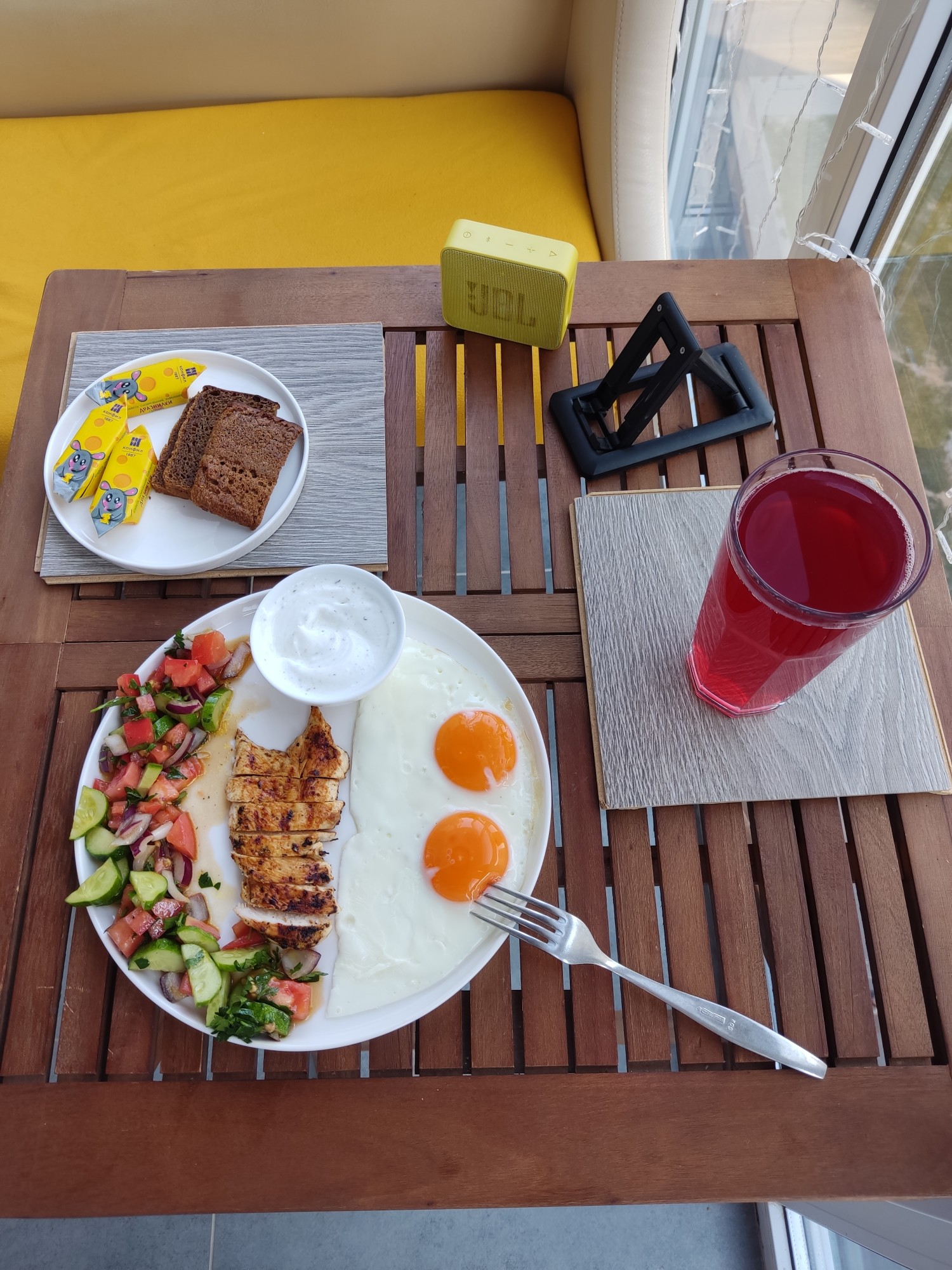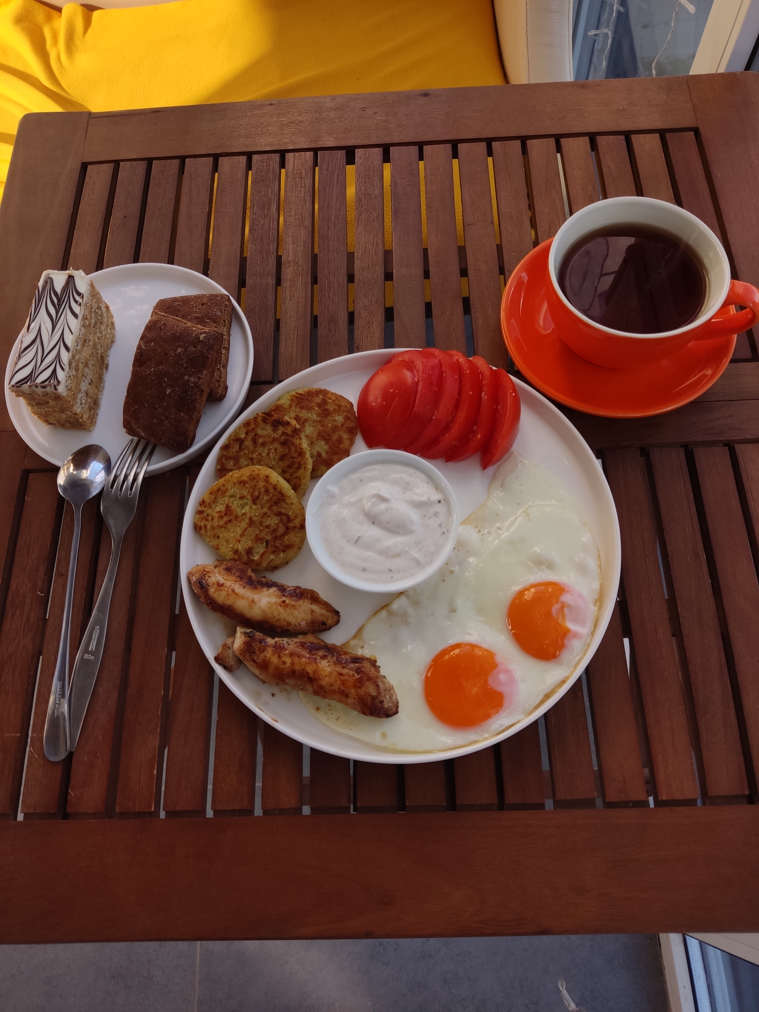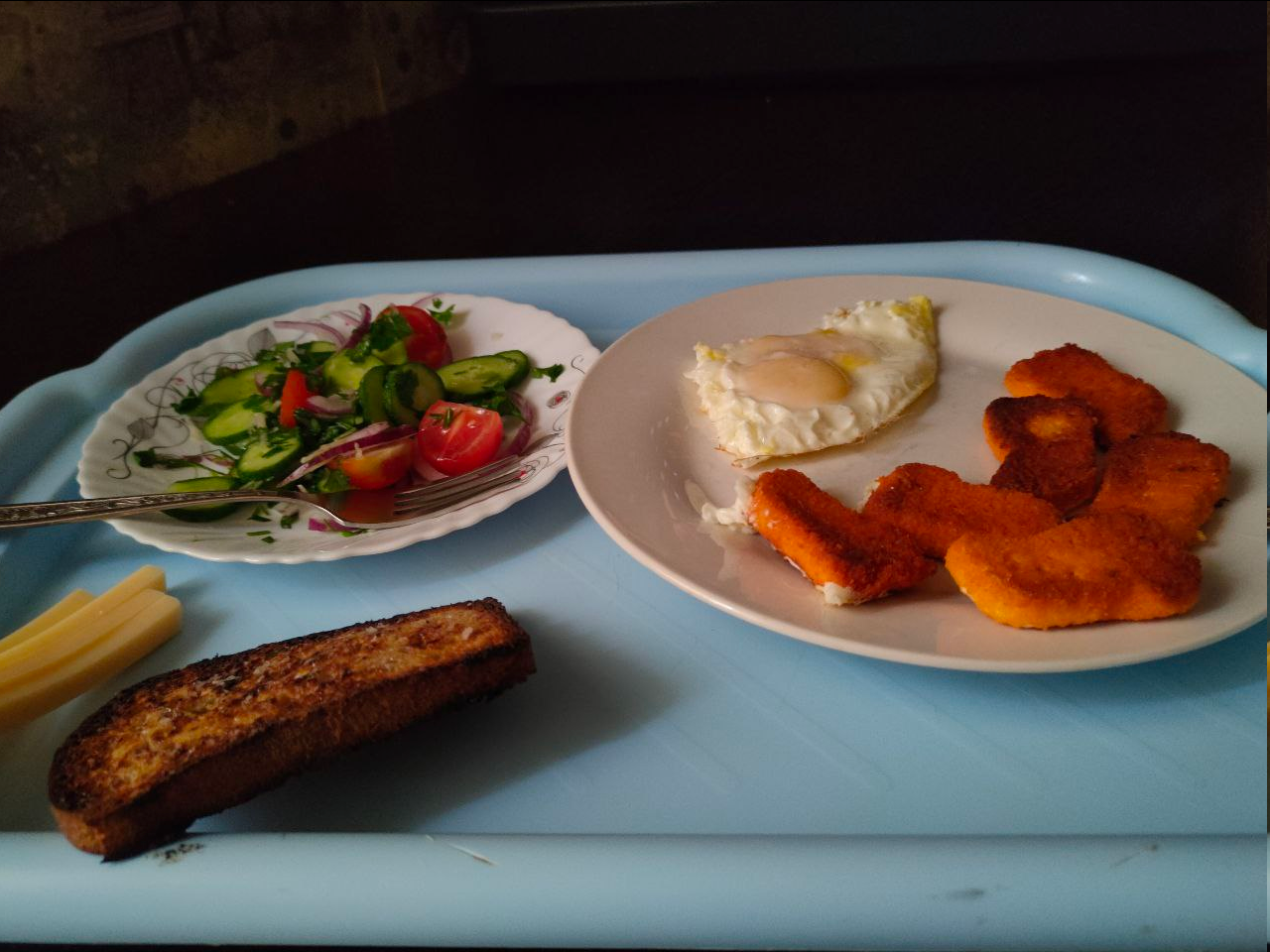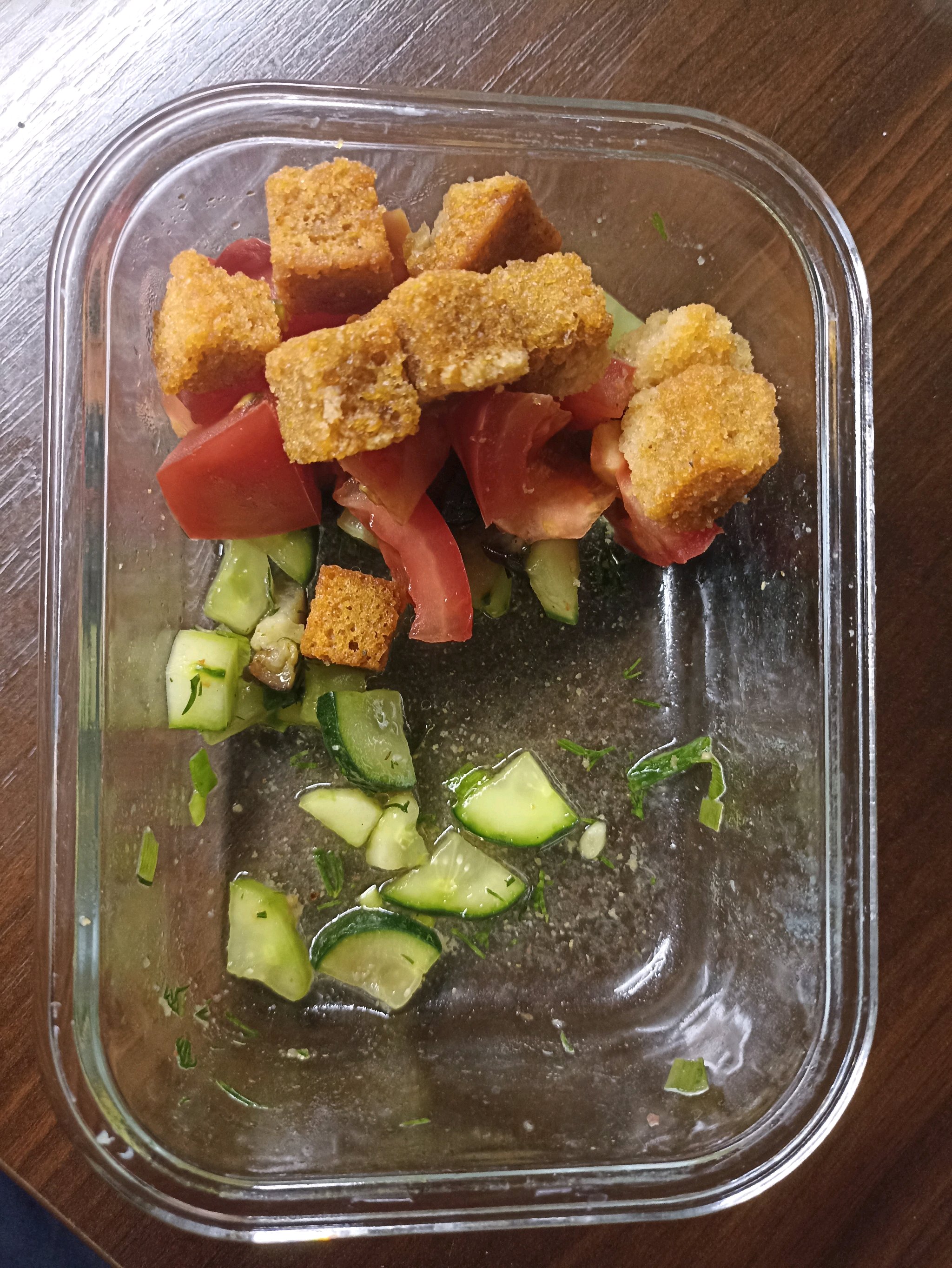 Вторая половина утренней куросиськи, картопля, салатик в этот раз без лука и картофельный хлеб, дабы было что в жижку макать