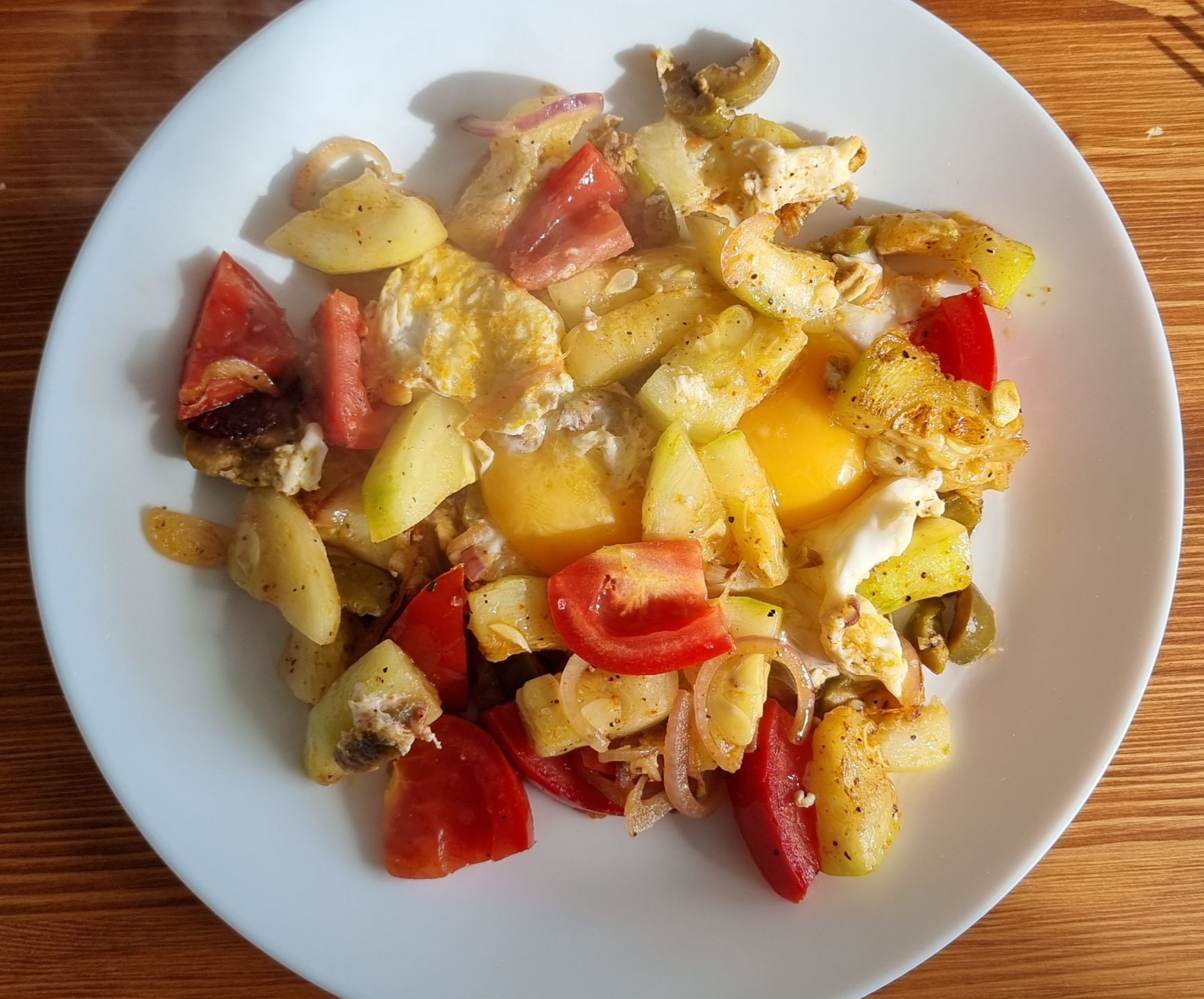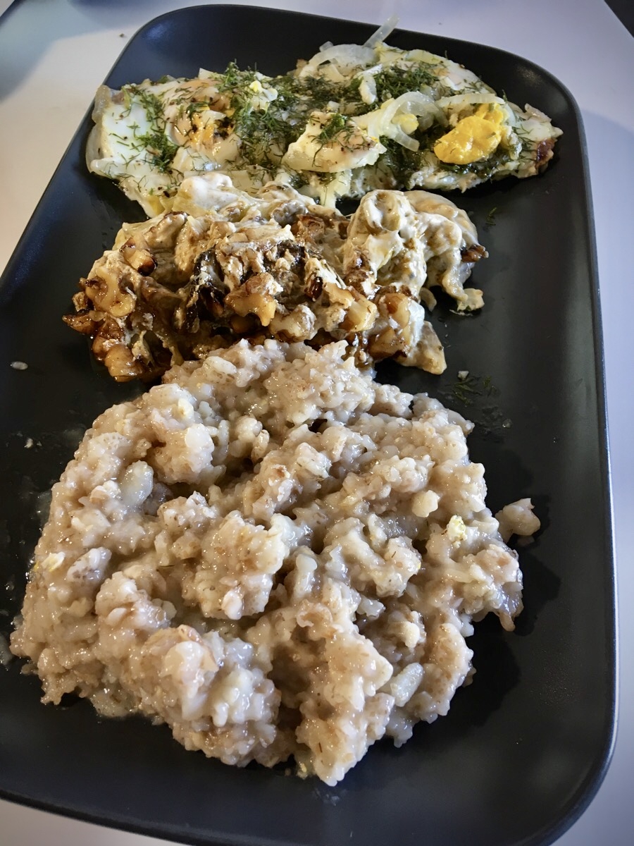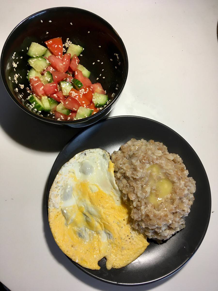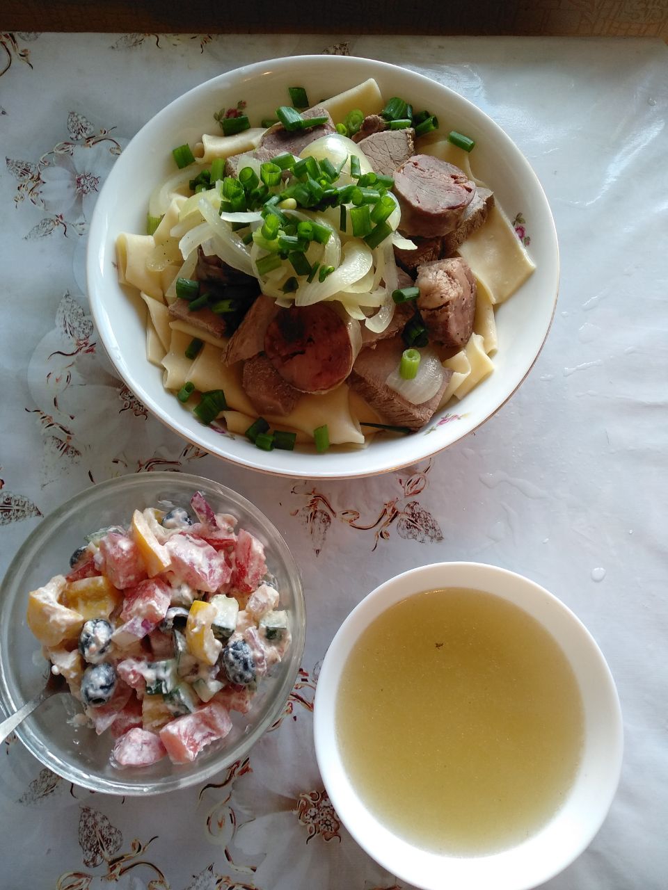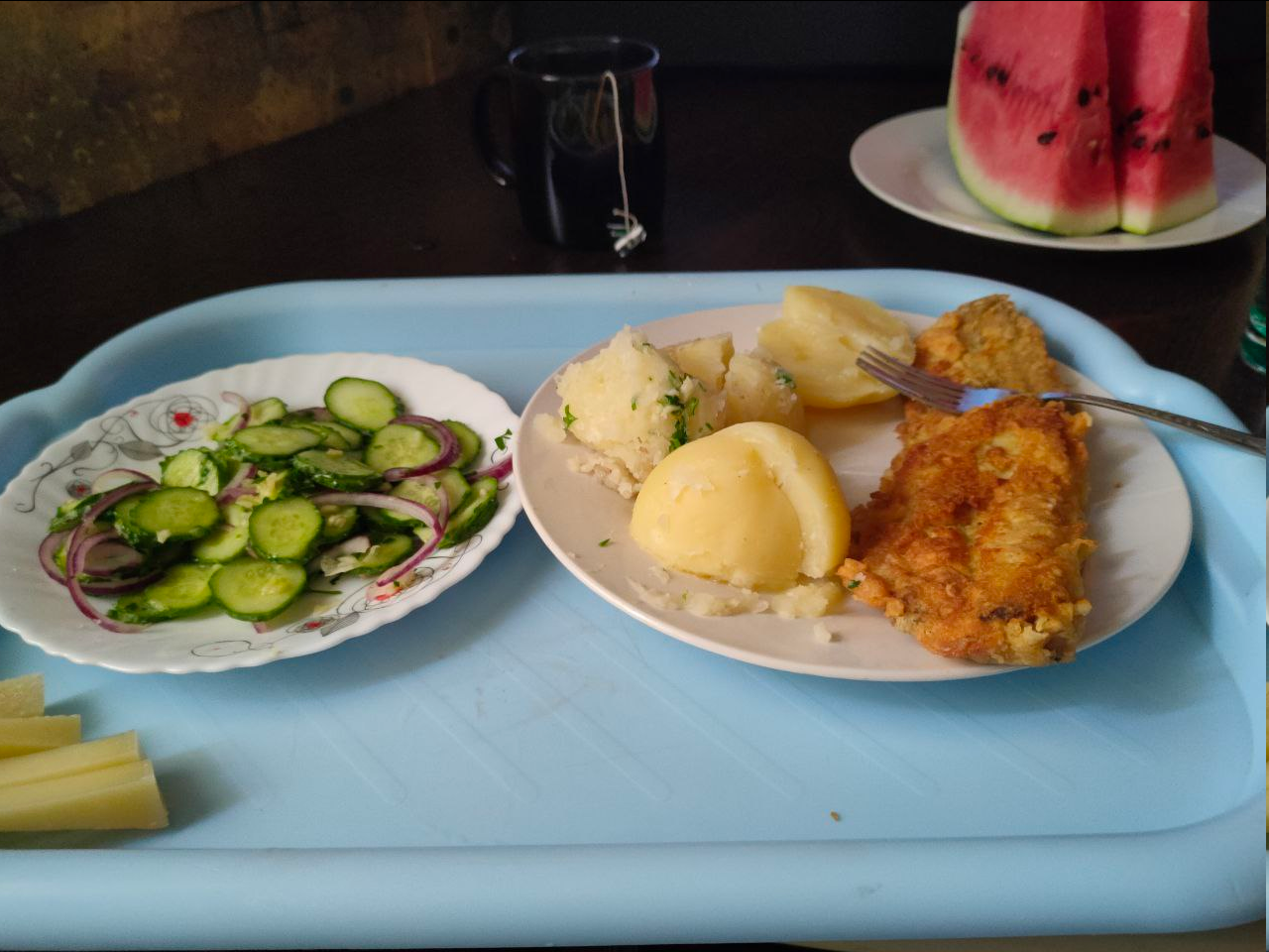 Вторая половина утренней куросиськи, картопля, салатик в этот раз без лука и картофельный хлеб, дабы было что в жижку макать