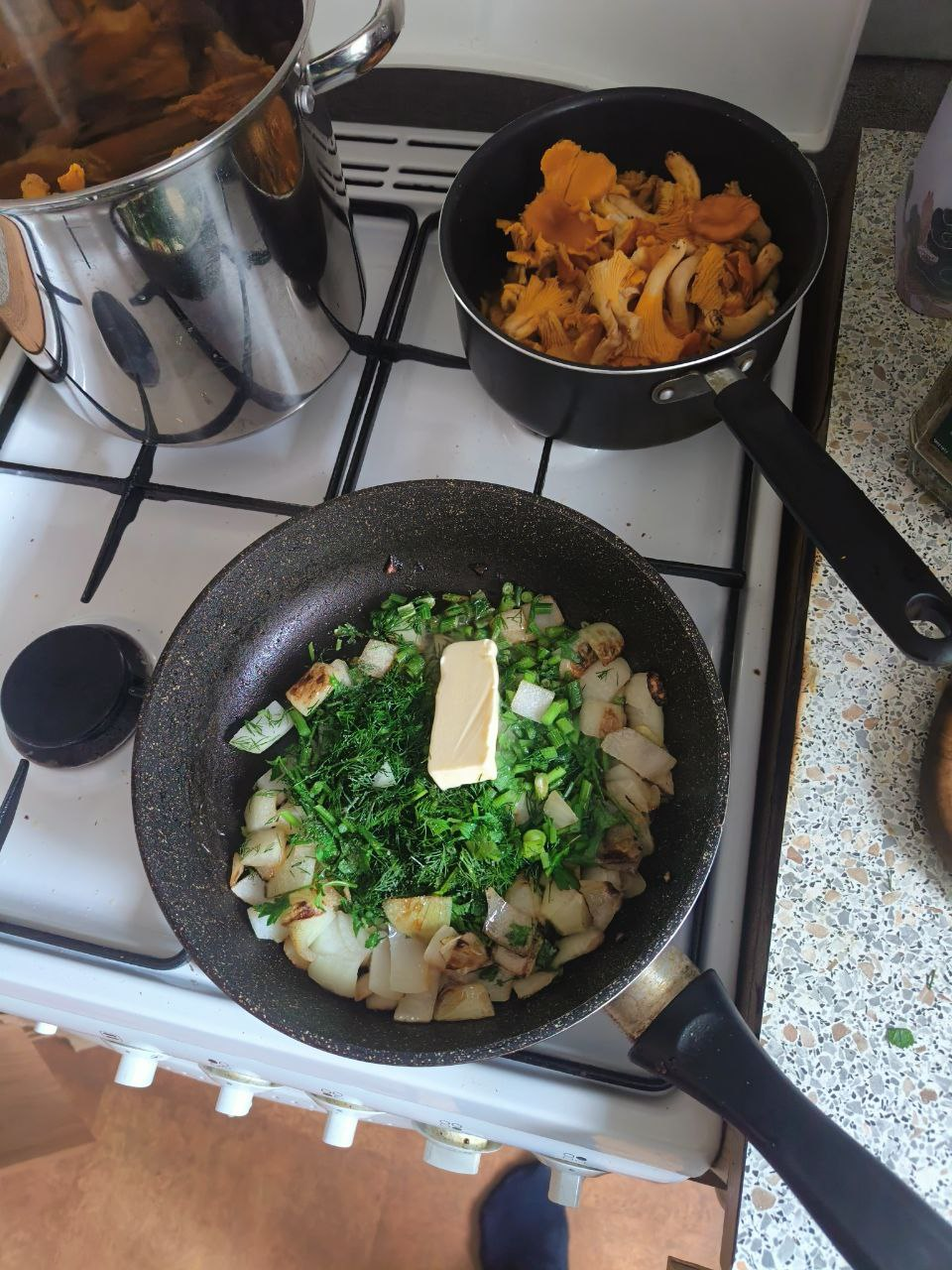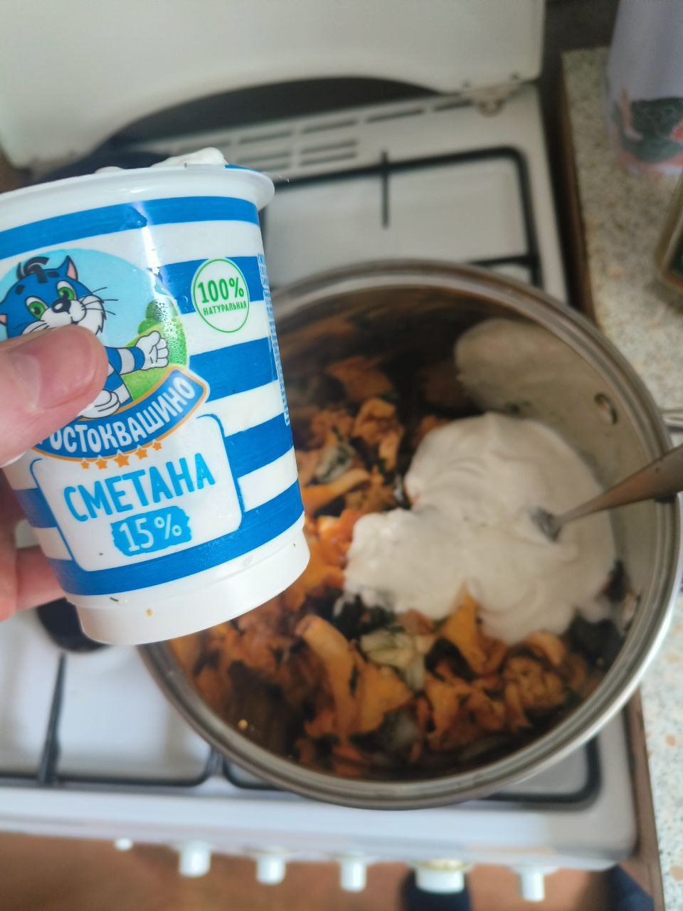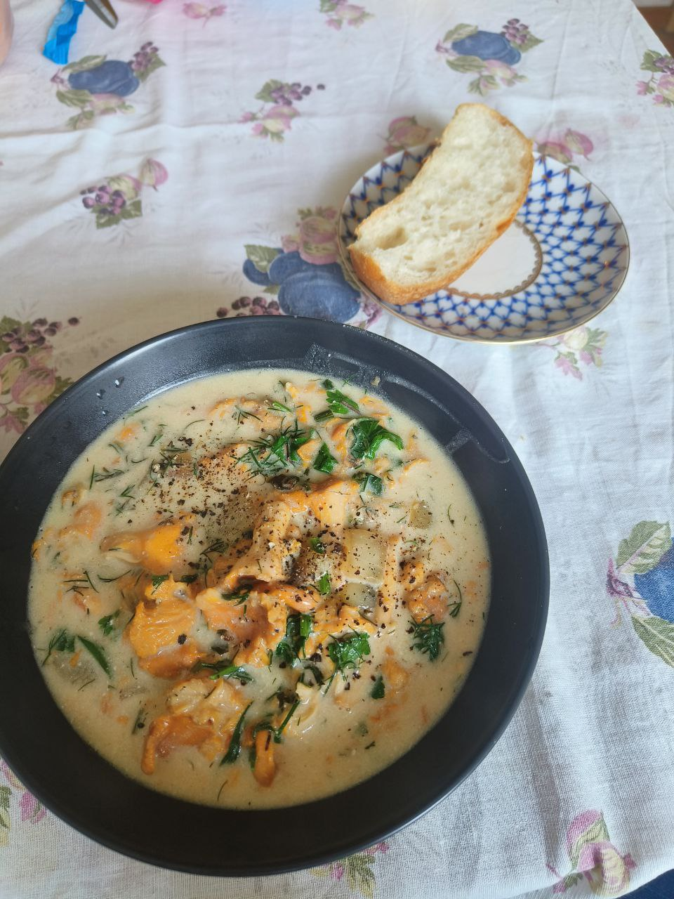 Сейчас дешевые лисички, поэтому купил 1.5кг, промыл в холодной воде, потом немного подсушил на плите. Начал готовить зажарку. Для зажарки взял 1 большую луковицу, и корешки от двух больших пучков петрушки и укропа. Обжарил на растительном масле, добавил 5 зубчиков чеснока. И немного сливочного сверху. Затем все грибы в одну кострюлю, туда же зажарку и банку сметаны. Две ложки крахмала, чтобы не отсекалось ничего. Черного перца побольше, немного лаврухи. Потомил так 5 минут, потом закинул оставшиеся вершки от зелени и сразу снял с огня. Ближе к концу ещё посолил и поперчил. Получилась очень уютная похлебка из лисичек. С краюхой хлеба на вкус как Успенский пост, как последние деньки лета. Хоть блюдо и почти постное, на вкус пустоватое, но я этого и хотел, однако к нему отлично подойдет кусок баранины, прямо внутрь, или кусочек красной рыбы