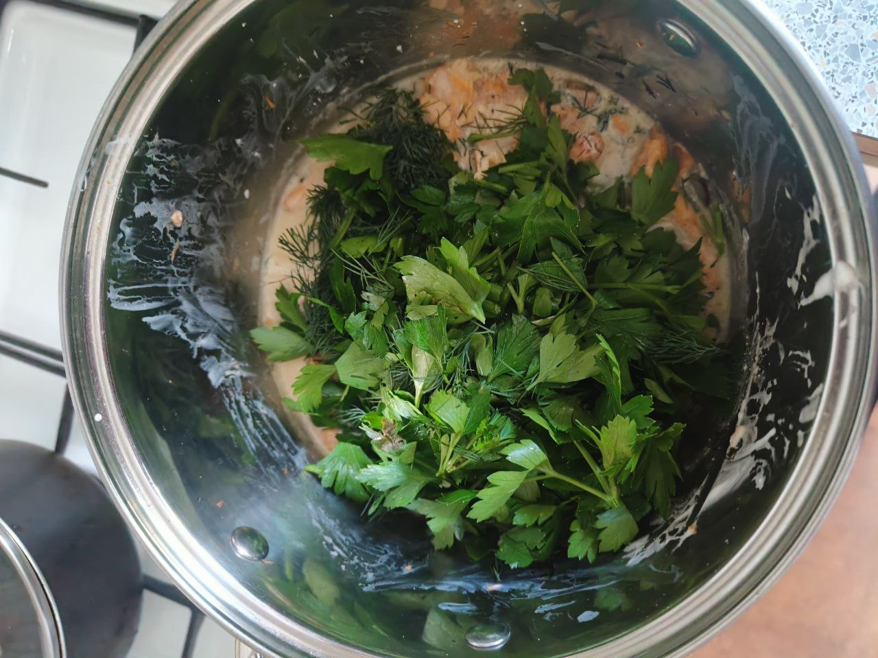 Рибу вареш, до готовности, вытаскиваешь и оставляешь охлаждатся. Кидаешь в бульон чищенный и порубленный на кубики картофель. Лук с морковью обжариваешь, добавляешь жарёху в бульон. Чистишь рыбу, отделяешь мясо и кидаешь в уху. Солишь, перчишь, рубишь зелень и чеснок, добавляешь со сливками. Отключаешь огонь, даёшь настоятся пол часика.