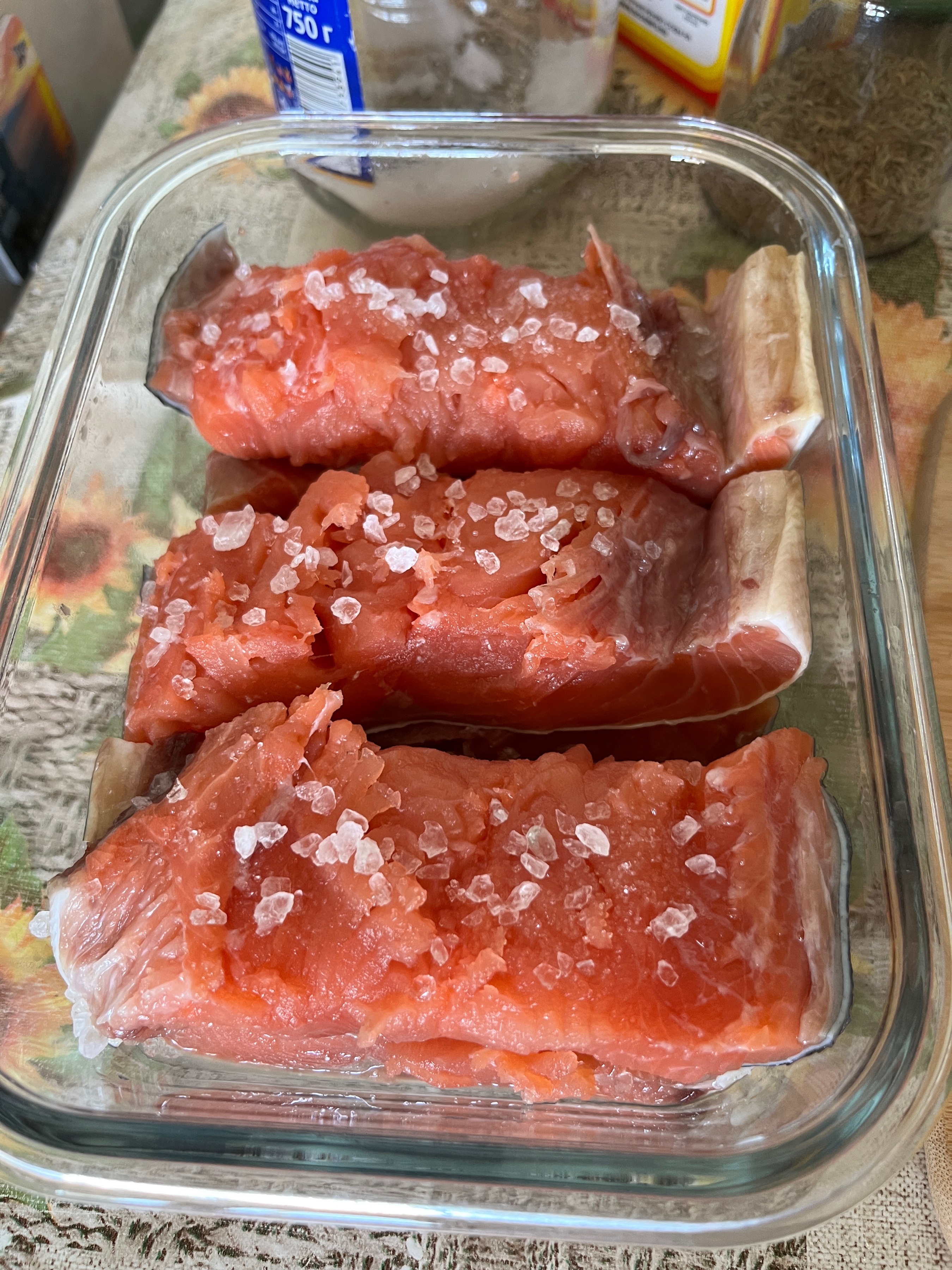 Годы шли, а я вдруг понял, что я по прежнему регулярно запекаю скумбриевича, и никак не развиваюсь в кулинарном плане, и не готовлю из рыбы ничего другого. Больше всего тянуло к слабосоленой красной рыбе, потому что на планете нет ничего вкуснее, особенно если она жирная. Изучив рынок, оказалось, что лучший выбор - дальневосточный (тихоокеанский) лосось, разумеется, дикий. Царица лососей - Чавыча, дворяне - кижуч и нерка, купцов представляют голец, кета и горбуша. Семга и форель на рынках практически все с ферм, поэтому они не рассматривались. Первой жертвой стал кижуч - сочный, спелый, двухкилограммовый. Приступаем к делу! Чтобы сохранить текстуру и вкус мяса, разморозил за сутки на верхней полке холодильника при +4. С помощью обратной стороны ножа, соскоблил слизь с тела рыбы, чешую убирать не стал, ибо не вижу необходимости. Тщательно протер пацана снаружи и изнутри бумажными полотенцами, поскольку потрошеную рыбу мыть нельзя, особенно перед засолкой, во первых мясо впитает влагу и станет рыхлым, во вторых быстрее начнет портиться. Полотенец потребовалось много, периодически протирал рыбу, доску и нож в процессе разделки. Разделав на филе, подготовил посолочную смесь. Соль только каменная/поваренная, не йодированная, морская тоже не подойдет, ведь в ней, помимо хлорида натрия, содержится йод, кальций, и другие микроэлементы, которые сделают наружный слой мяса жестким, а йод и вовсе обжигает мякоть. Помол соли должен быть только крупный, идеально - помол №3, где размер кристаллов от 2 до 5мм. Соль мелкого помола мгновенно растворится, пересолив и сделав жестким наружный слой мяса, и недосолив глубинные слои, поэтому только крупная каменная соль. Взял еще пакет помол№4, но там уже адски большие куски до 15мм, это как то перебор. Сахар - второй ингредиент, необходимый при посоле. Дозировка слишком мала, чтобы сделать хотя бы намек на сладость, но достаточна, чтобы не дать рыбе пересолиться и задеревенеть, а также чтобы немного усилить вкус рыбы. Говорят, что с медом вкуснее, поэтому один кусок я сделал с добавлением меда, в качестве теста. Получилось 6 кусков от 190 до 280гр, а значит для каждого куска нужно было рассчитать дозировку, ну это дело пары минут. Солить на глазок, "как получится", не стал. Дозировка стандартная: соль - 3% от веса филе, сахар или мед - 1.5%. Соль и сахар перемешиваются, и кусок обваливается в смеси со всех сторон. В случае с медом - сначала кусок натирается медом, затем обваливается в соли. Вакуумирование. Если нет вакууматора, можно положить рыбу в блюдо, укутав пищевой пленкой, и убрать в холодильник на 1-2 суток, дольше лучше не надо, из за негерметичности. Но я хочу, чтобы рыба дольше хранилась, как минимум неделю, поэтому решил завакуумировать куски филе. В процессе посола, из рыбы начинает выделяться жидкость - тузлук. Существует два способа, сухой и полусухой: при сухом тузлук периодически сливается, хотя бы раз в 12 часов, при полусухом рыба солится в своем же тузлуке. Я выбрал второй способ, тем более, что в вакууме не будет кислорода, и тузлук сможет прожить гораздо дольше, не начав портиться. Последний оставшийся вопрос - срок посола. Буду пробовать от 2х до 5 суток, каждый день поочередно вскрывая пакеты, чтобы понять, какой же вариант лучше. Пересолиться даже при 5 дневном варианте филе вряд ли сможет, из за небольшой дозировки посол