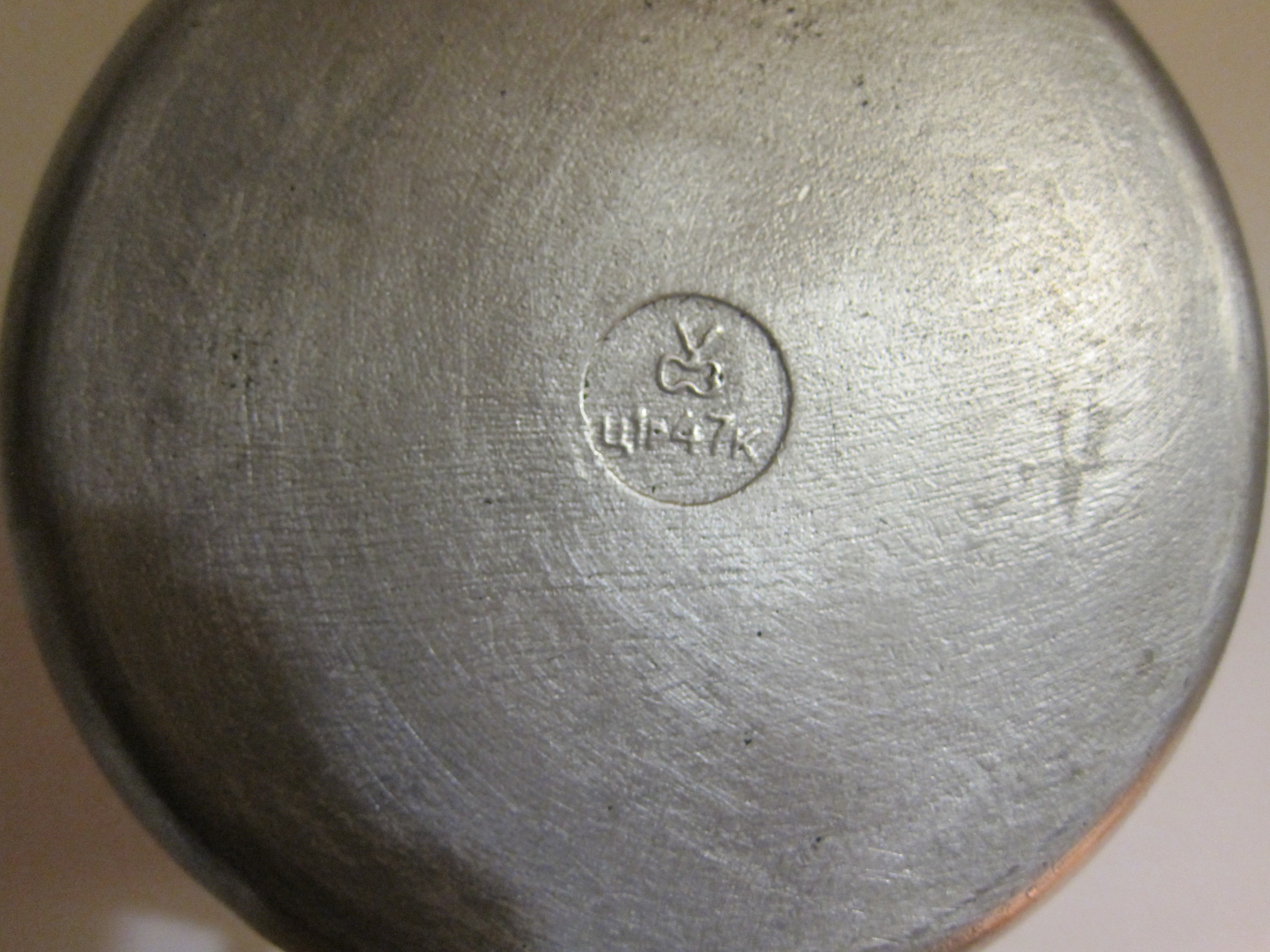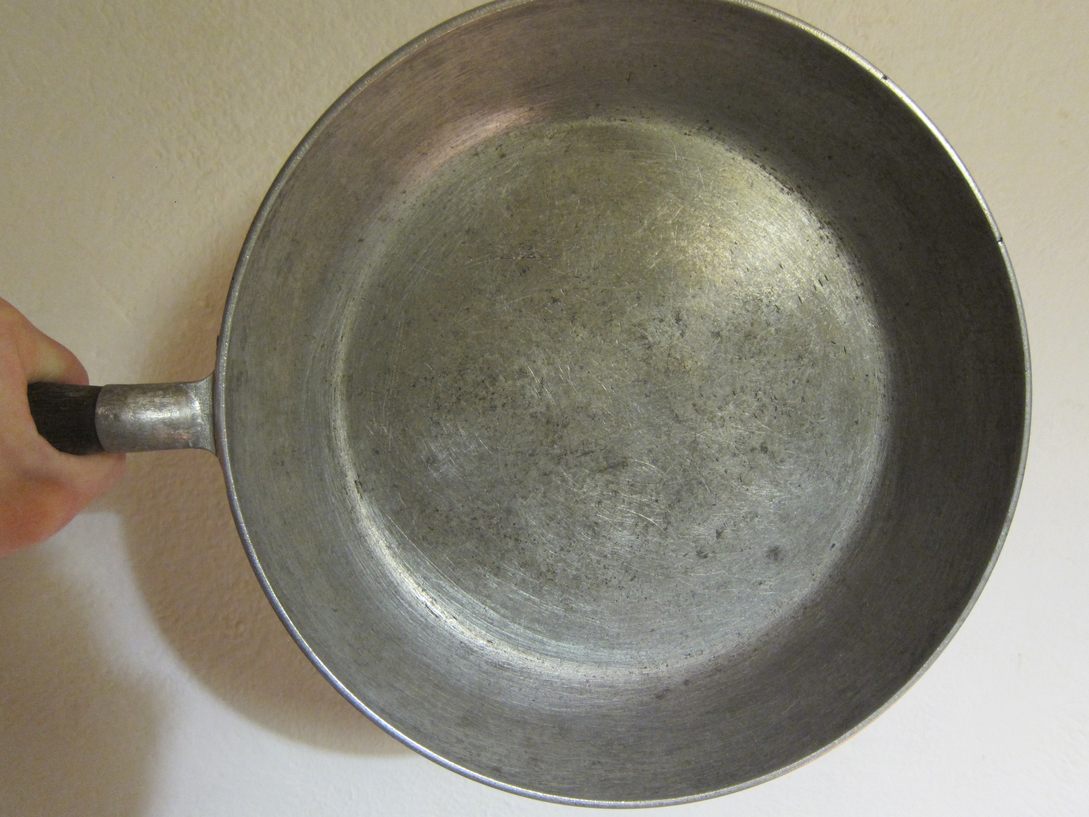 Вот тебе фото моей алюминиевой сковороды, которую использовала ещё моя давно покойная бабушка. Недавно её чистил. Сковорода сто лет назад вся исцарапанная, плюс дефекты литья. Дно было всё черным.