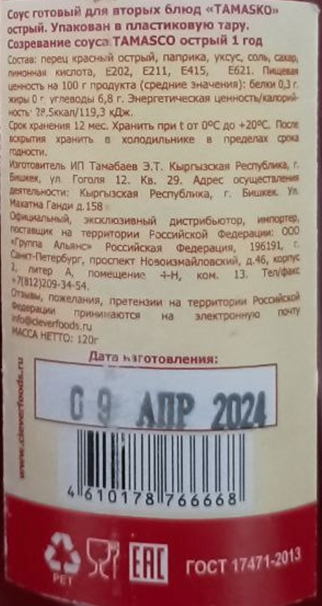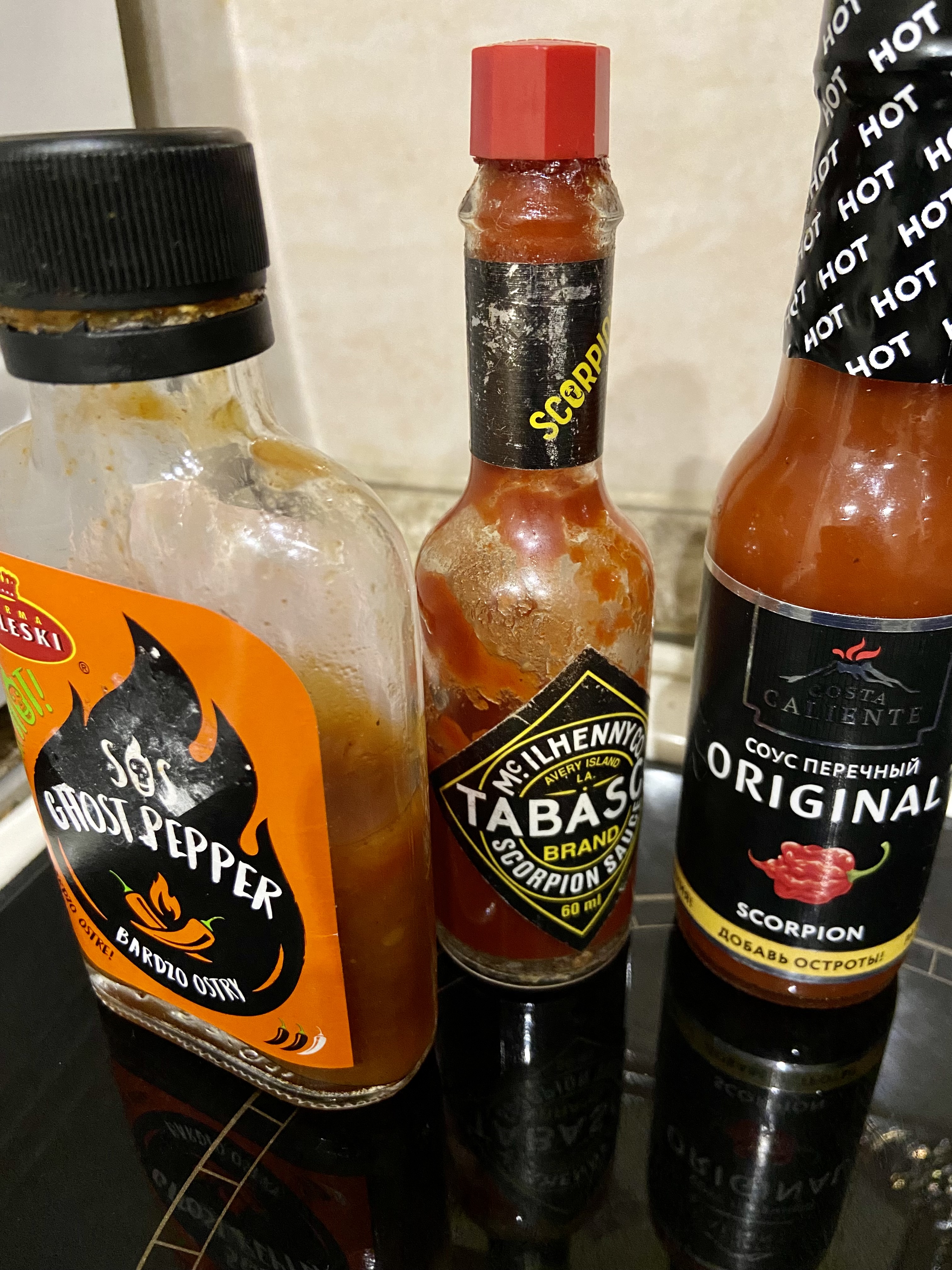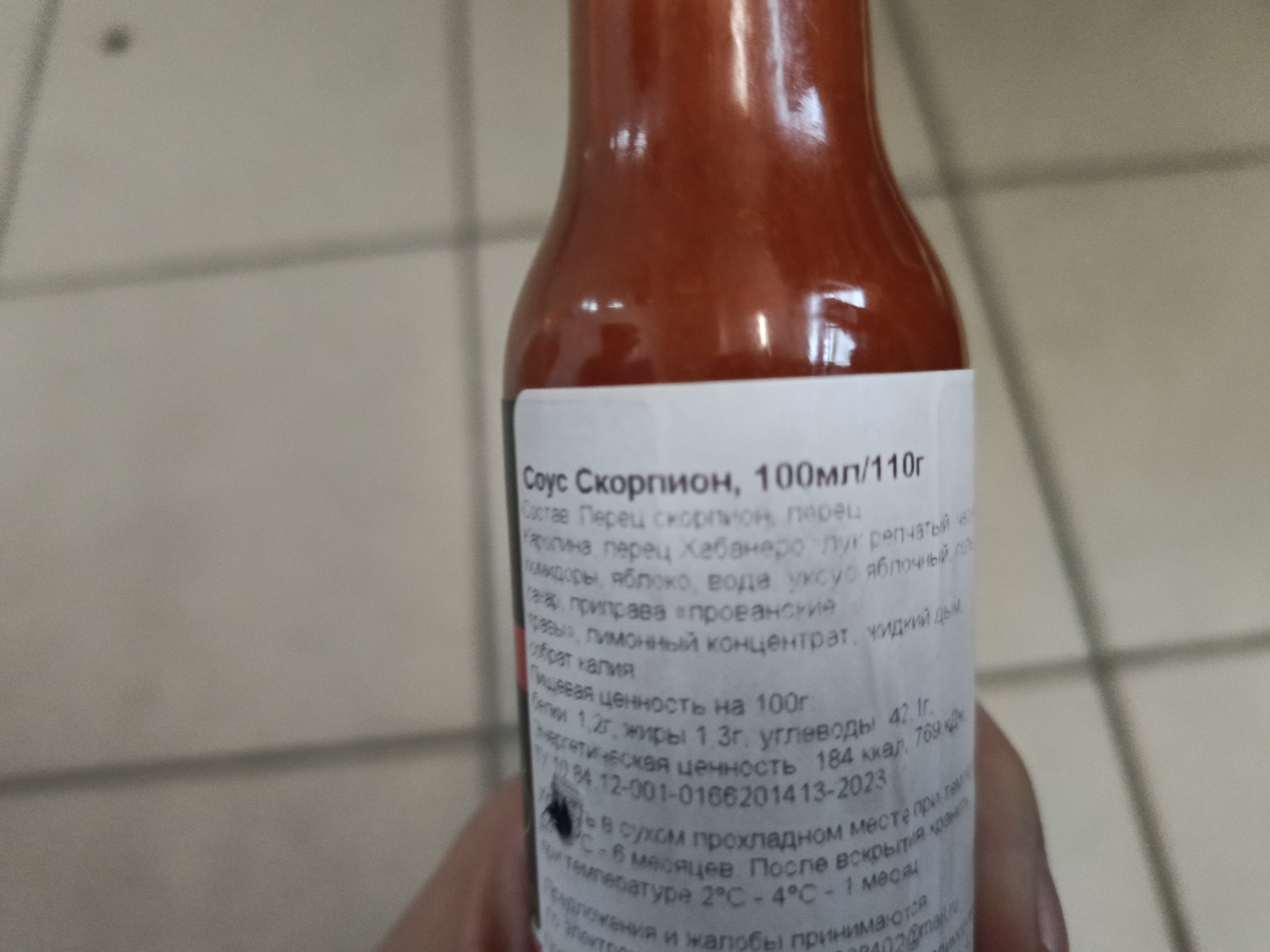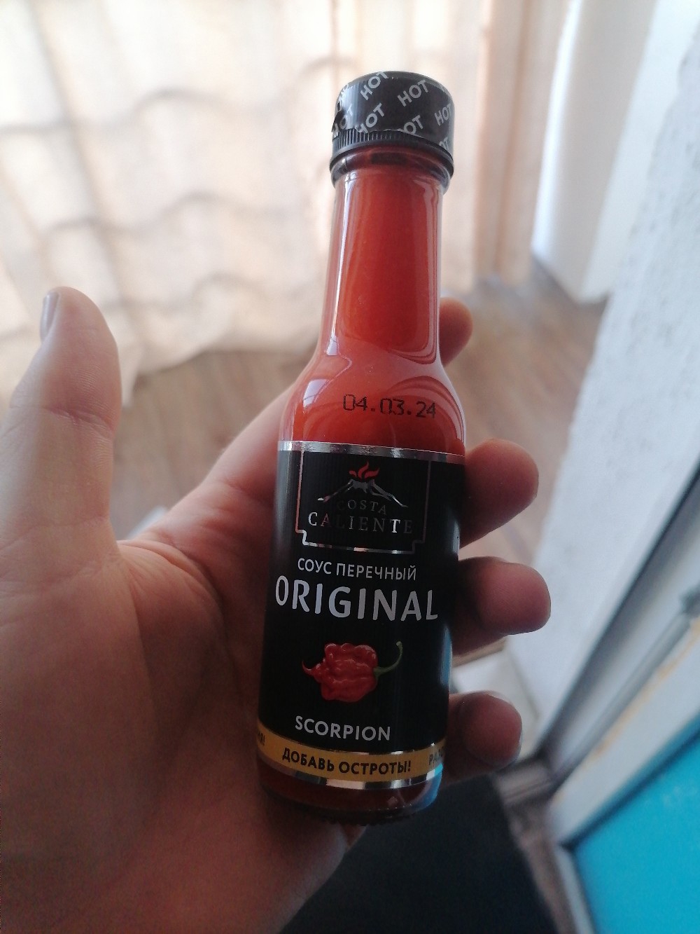 На днях выбросил больше половины пузырька табаско скорпион. Обычный красный табаско могу просто так ложками жрать. Остренько, но уксусная вонь все портит, поэтому не люблю его. Как-то насмотрелся видосов, решил что угорел по остроте, из быстро доступного на тот момент был только скорпион, первое время и в бутеры его капал, и добавлял во все подряд, позже, когда угар прошел, понял что мне надоело постоянно есть жгучую еду. А для ощущения приятного тепла, не перебивающего вкус блюда, хватает 2 капли на тарелку. В итоге через какое-то время вообще забыл про него, недавно нашел в холодильнике, увидел что ему уже больше 3 лет с даты изготовления, может и не летально, но подумал, нахуя мне жрать 3+ летний соус и в итоге выбросил. А так амца постоянно в холодосе, банки хватает где-то на пол года - год. Держу в курсе. Да.