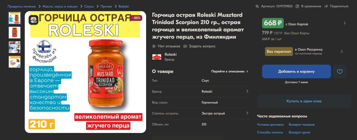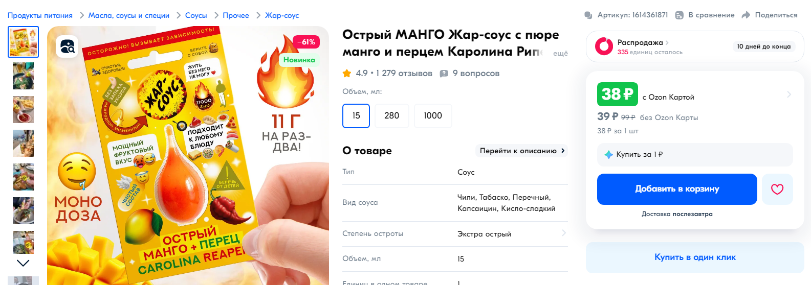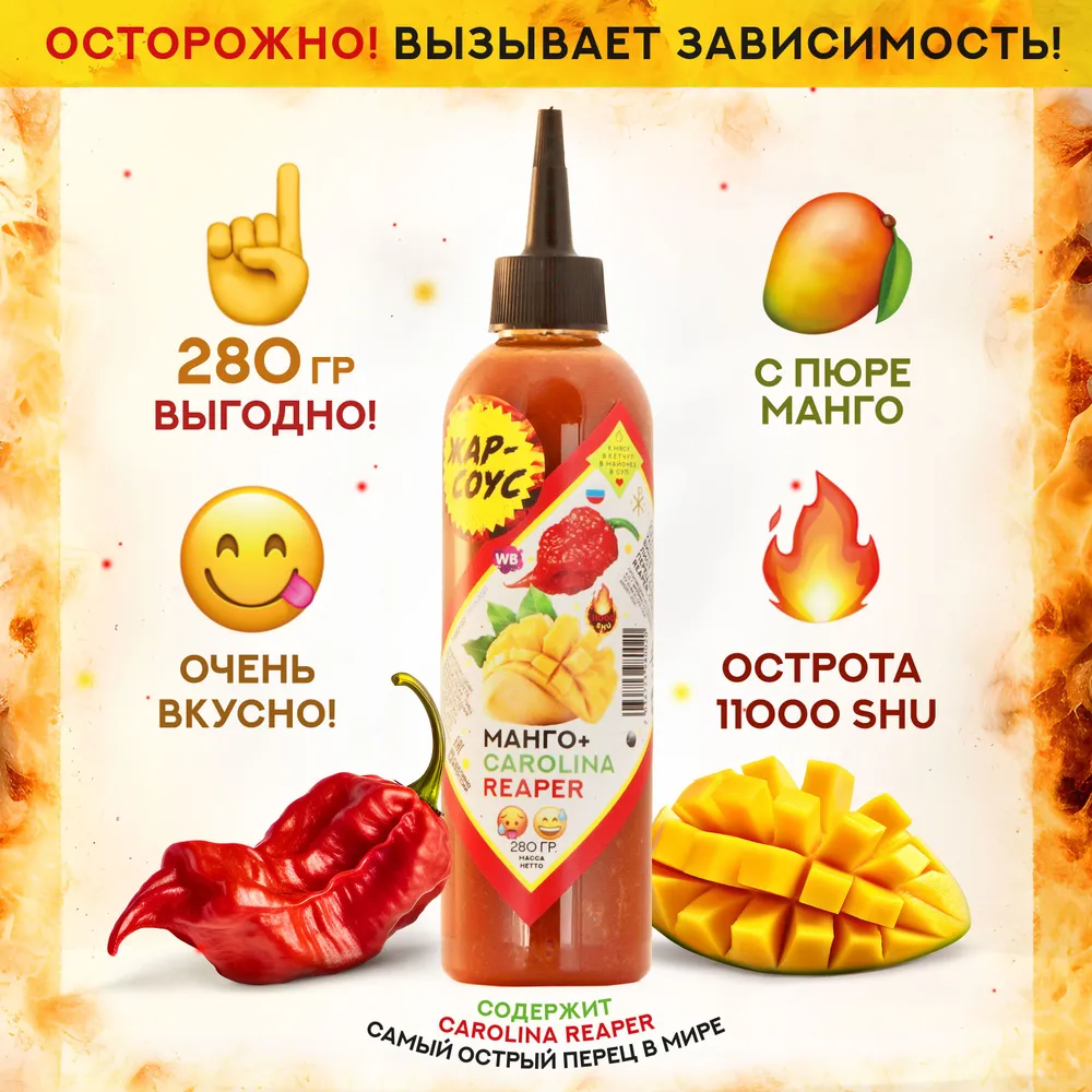 Выглядит как кал для нормисов, но внезапно вполне годно. Сначала сладенько и чувствуется вкус манго, но почти сразу начинает припекать и припекает ощутимо, хоть и не слишком сильно, примерно на уровне табаско скорпиона или даже посильнее. Никакого уксуса во вкусе нет, если вам это важно. Не горчит как экстракты или бульдак, возможно даже не наебывают что тут есть серьезный перец в составе, хотя скорее всего это нихуя не каролина или ее просто очень мало. МОНОДОЗА за 38 рублей с озона - это вообще имба дикая, идеал чтобы попробовать и решить надо ли брать большую бутыль. Тащемта, она будет моно только для прожженных, для обычных любителей на 2-3 раза хватит от души поперчить.