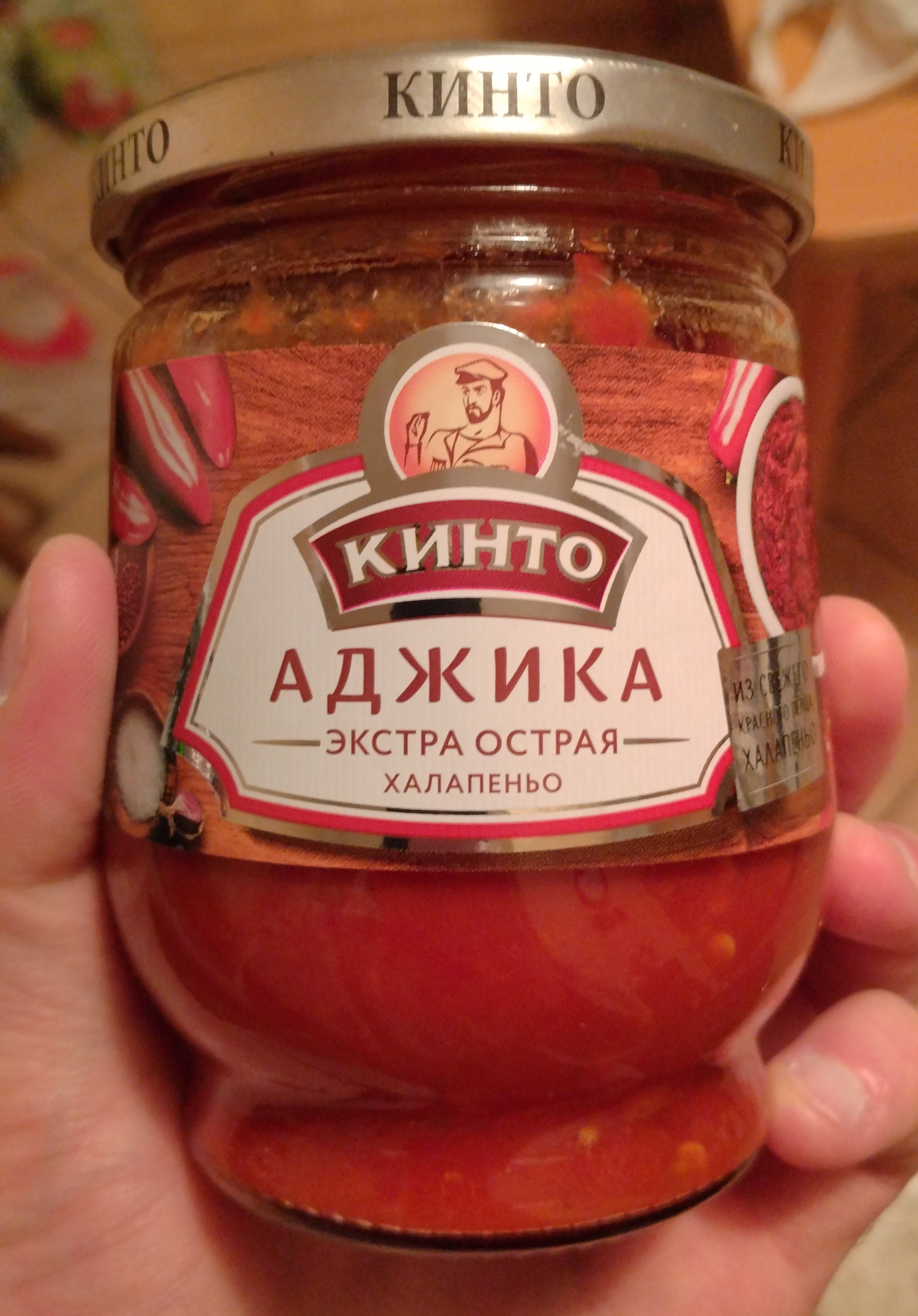 Внезапно вин! Только немного не в ту степь где ожидалось. Никакая это не аджика, конечно - она НЕ сухая, НЕ солёная (совсем, что и вовсе удивительно), и вообще сока помидоров в банке, кажется, больше всего остального. Но! При всём при этом по меркам обычного продуктового магазина вполне нормально жгуче. Я бы сказал, по вкусу максимального точно описывается как "лечо из ощутимо горького перца". Мне прям зашло макать корки от пиццы. На бутерброды тоже должно хорошо пойти, если погуще набирать ложкой.