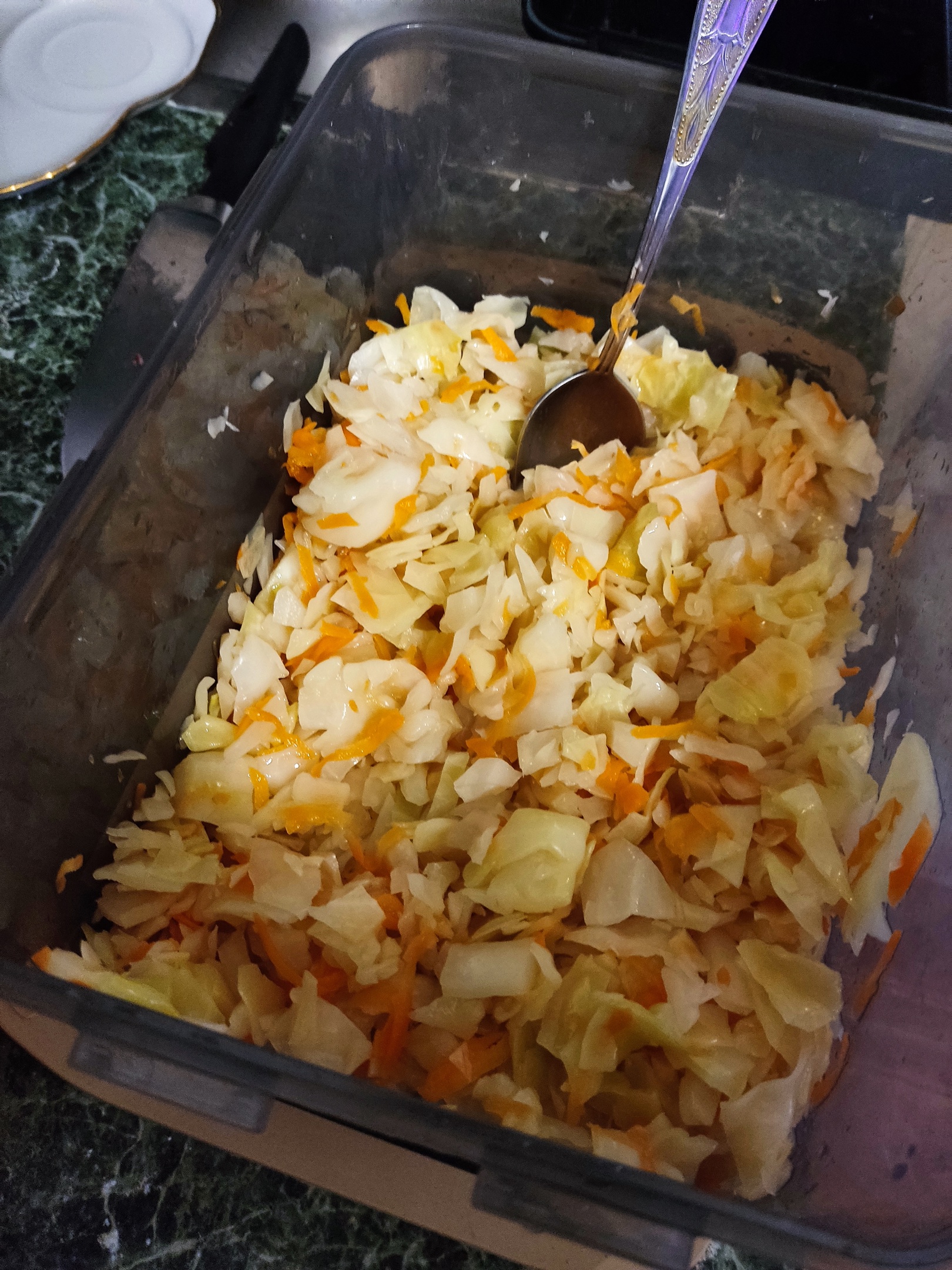 День третий. Утром вскрыл контейнер, с помощью перемешивания выпустил пердёж. Многие советуют протыкать, но я предпочитаю переворачить аккуратно листы капусты с самых глубин, чтобы газ максимально вышел из всего содержимого. Потом ещё постучал по контейнеру со всех сторон, чтобы вибрациями выгнать побольше газа. Закрыл, потом проделал аналогичные действия в 12:00, после чего упиздовал на работу и проделал то же самое в 22:00. В 22:00 запаха пердежа уже почти не было, почти весь запах составляет довольно-таки забористая уже кислота. На вкус тоже уже конкретно кисляк пошёл, поэтому не уверен насчёт целой недели квашения, т.к. температура в течение дня ближе к 24-26 градусам. Скорее всего, завтра целый день пускай ещё постоит, а вечером уберу в холодос, потому что ферментирование хоть и сильно замедлится, но полностью не остановится.