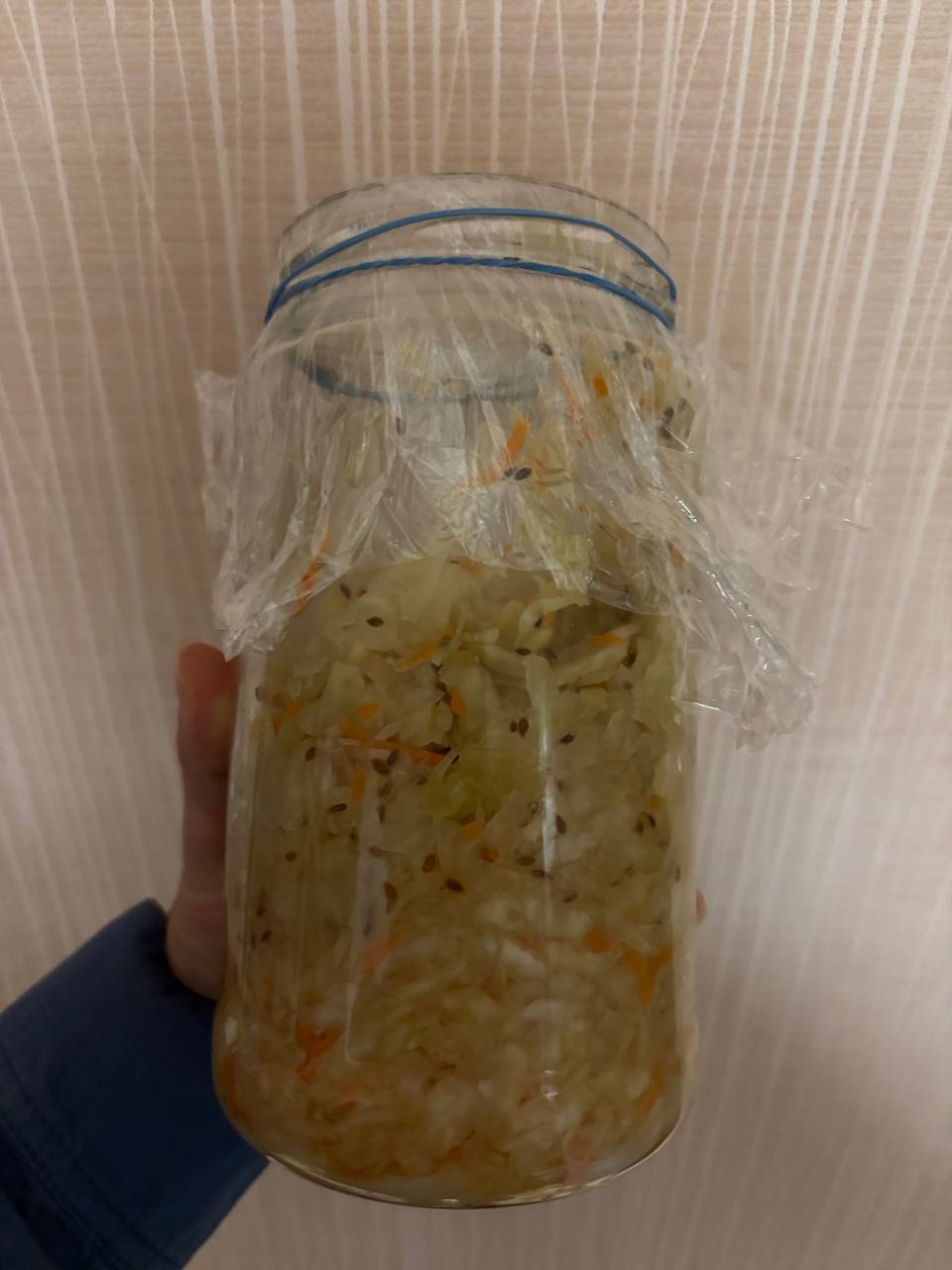 Крышки хуишки, через которые все проливается, гнеты хуеты, чет вы тут велосипеды придумываете. Короче просто утрамбовал капусту, даже воды не добавлял, сверху накрыл листом капусты, предварительно проткнув его зубачисткой, по бокам воткнул 2 зубочистки для доп фиксации и все, просто марлей и сверху просто поставил крышку. Алсо, хотел еще сделать ферментированную морковь, с чесноком, имбирём, паприкой, перетер наверное 15 крупных моркови, а это только пол банки, пиздец, пол качана капусты есть, ща с морковью добью верх похуй.