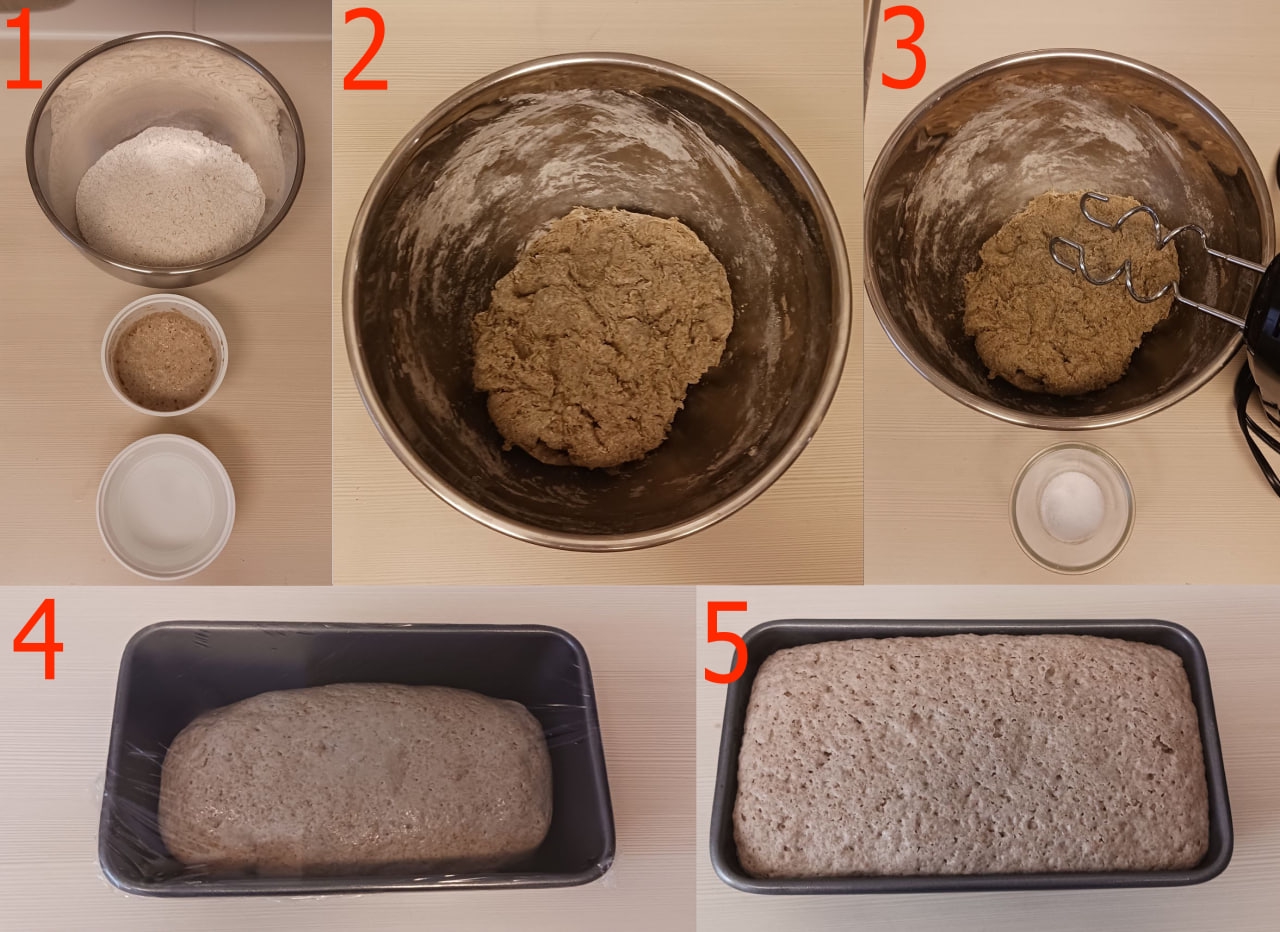 Пик 1: 1 Смешал все кроме соли (закваску100%, воду(26С) и муку) 2 Оставил в таком виде на час 3 Добавил соль и перемешивал миксером, потом руками минут 20, оставил еще часа на 2 4 Отформовал и положил в смазанную маслом форму мокрыми руками(тогда не будет прилипать) и оставил в теплом месте пока не увеличится в размере. 5 Размер перед запеканием.