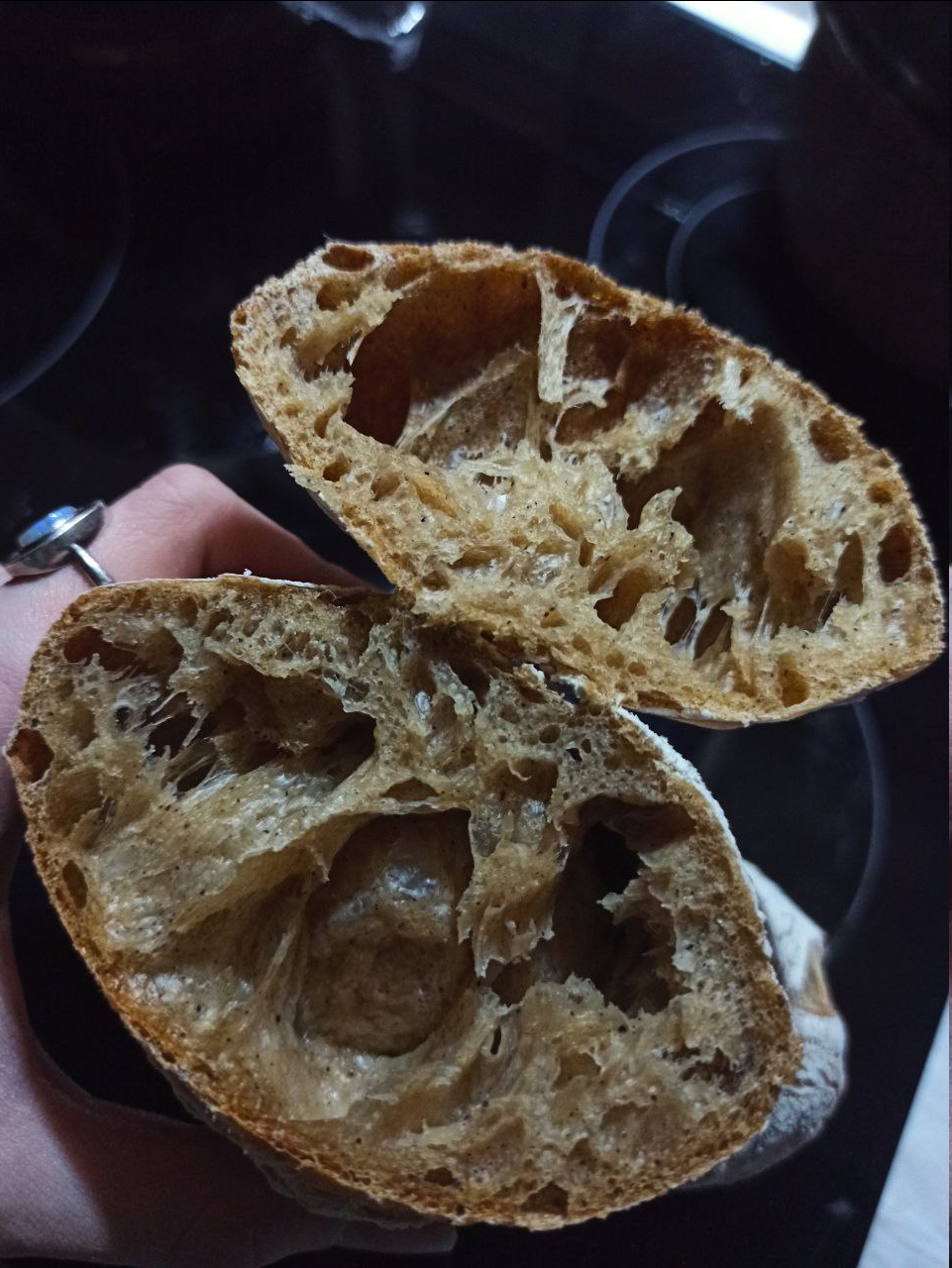 И ещё после того как вымесил его в самом начале и оставил ферментироваться, снова его харрдово вымешиваешь нельзя. Этим ты только все испортишь. Нужно просто сложить с каждой стороны по разу и оставить на пол часа. Повторить раза 2 и в форму положить. Суть в том чтобы укрепить и разнообразить структуру, но не проебать объем и газы.