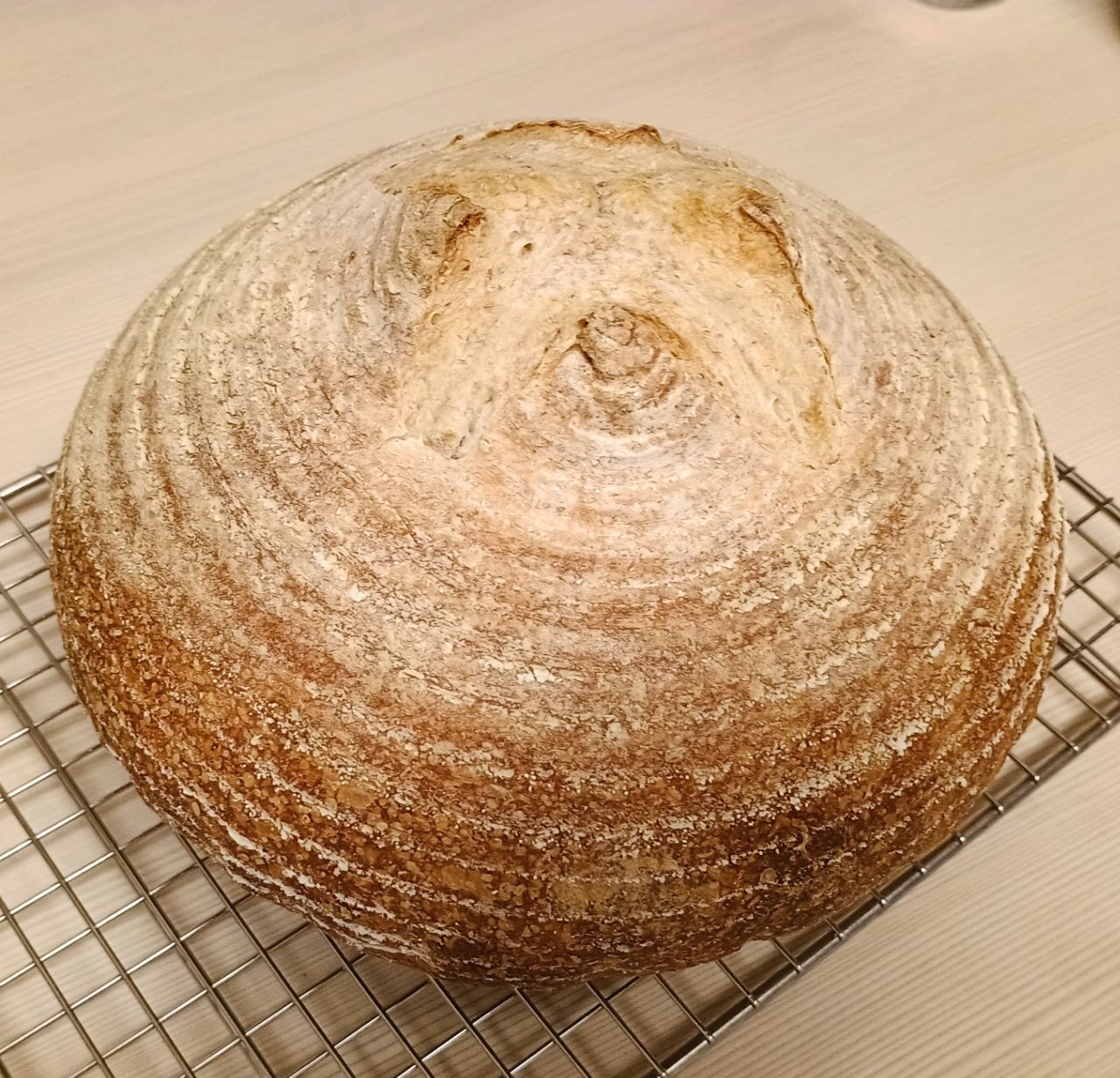 >>750994 У меня примерно так же сегодня вышел по виду, только нарезов побольше навалял. Опять не выдержал, пока не остыл стал наворачивать с маслом, вроде очень годно. Теперь завёрнутый лежит в пакете, доходит. Будет мягче корка.