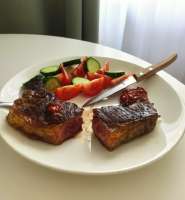 На завтрак (да, я встаю в 11 и жру в 2 т.к. там одни таблетосы пить надо и мне не хочется два раза жрать ради этого) котлетки и салат из помидор со сметанкой. А, ещё торт остался со вчерашнего ДР (34 исполнилось).