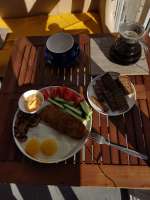 После очень обжорной рабочей неделе, что завершилась пирушкой по проф.празднику, решил устроить себе лайтовый для живота завтрак Пюрешка из одной картофелины, патиссон пробую впервые, ничё так, один помидор и два яйца. Ну как два, в пюрешке ещё одно яйца замешано. Но в пюрешке магазинное, а отварены деревенские. А сладенькое забыл с вечера затарить