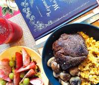 >>674395 Да ничего хитрого. На дно кладешь розмарин, сверху нарезаешь картоху, чистишь апельсин, нарезаешь туда же, корки отдельно по углам раскладываем - потом корки можно легко убрать. Засыпаем все нарезанным луком. Выкладываем голени, мажем соусом. Соус - сметана, чеснок, копчёная паприка, ром Bacardi, немного карри и апельсинового сока, соль, сахар, черный перец, тимьян. Закрываем фольгой и на 150 градусов в духовку на час-полтора. Потом фольгу снимаем и включаем гриль до момента пока не появится корочка