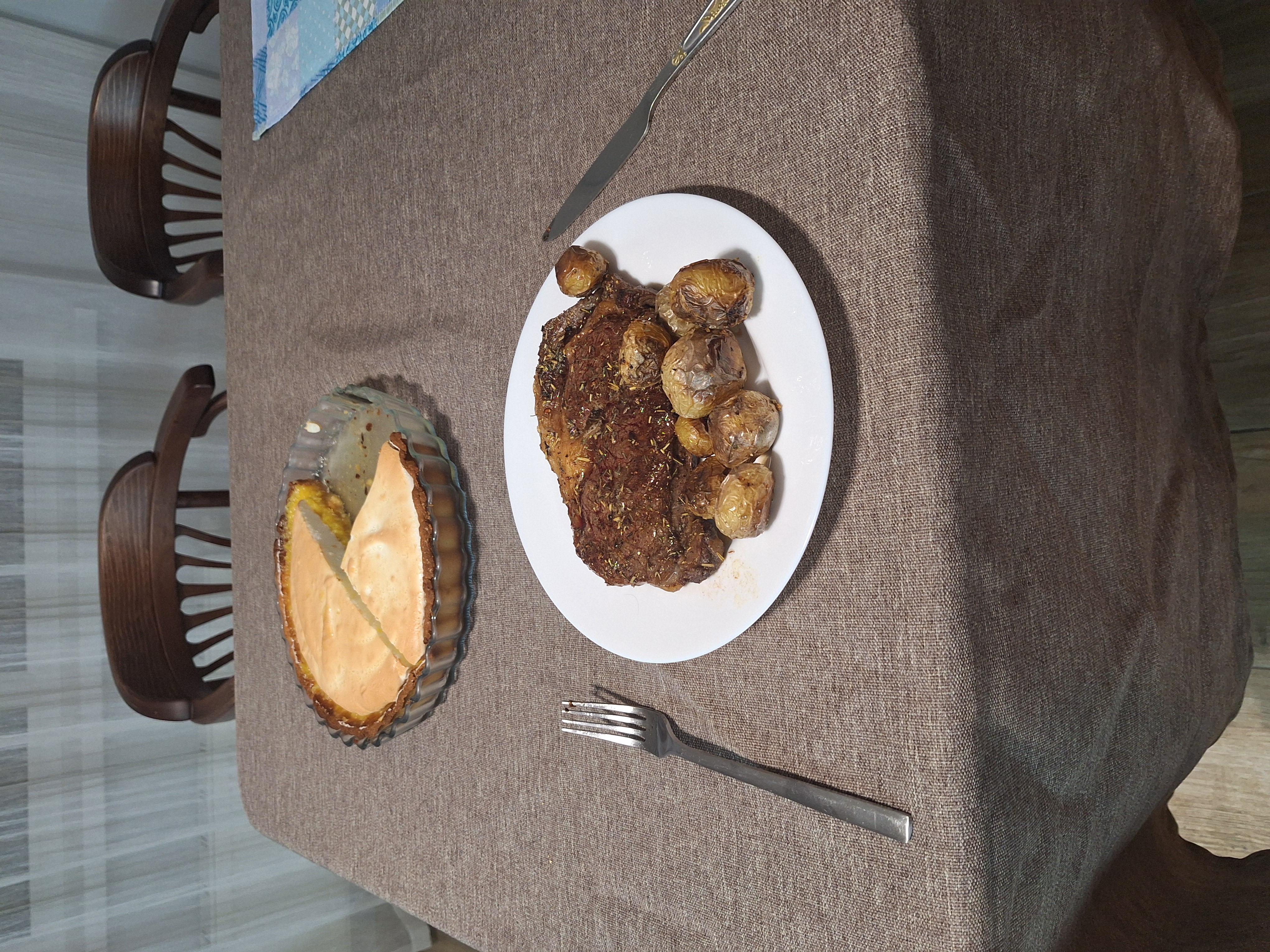 Холостяцкий стол: стейк рибай неплохо, запечённая картошка неплохо, лимонный тарт с меренгой полный фейл: корж жёсткий, курд пустил жидкость и оказался слишком кислым, меренгу перевзбил, но в совокупности неожиданно съедобно. Загаженная кухня стыдливо оставлена за кадром.