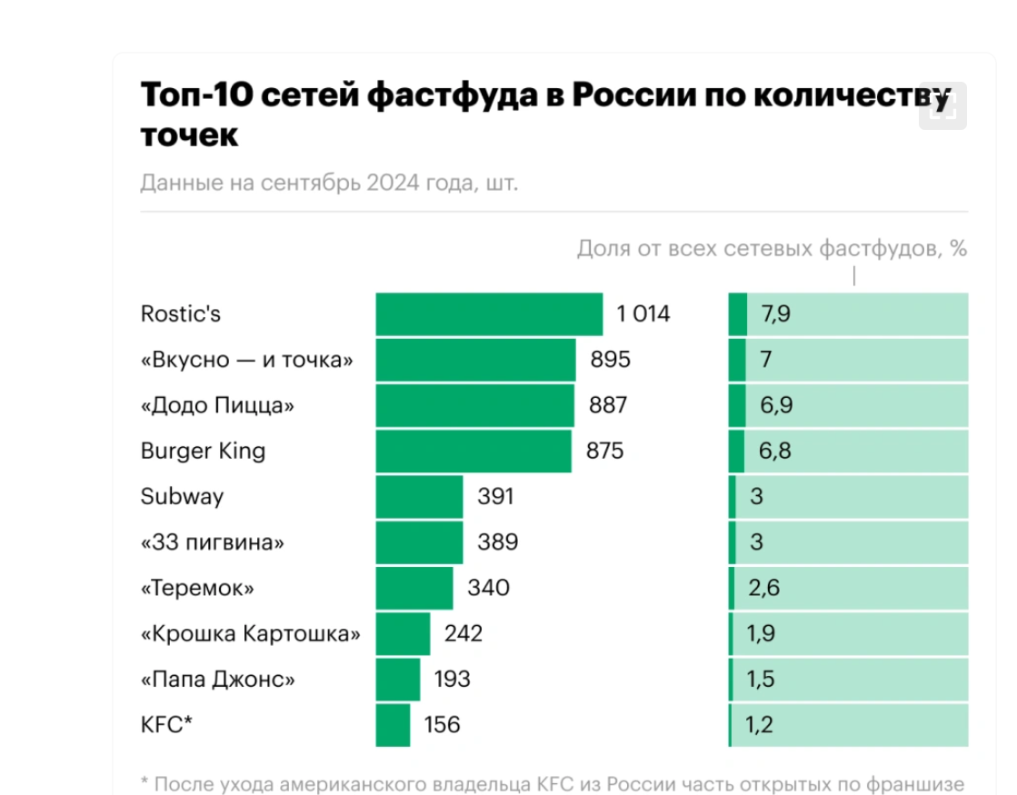 Кфс лидирует конкретно по количеству точек (кафе), не путай терминологию.