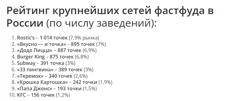 Но то что ростикс самая крупная сеть фастфуда это просто математика, тут уже нет двойного толкования терминов.