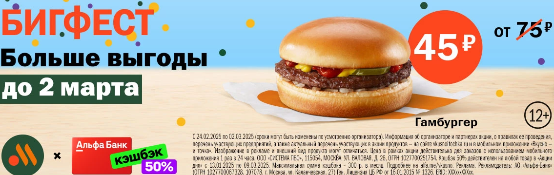 >>701403 >Во первых ты считаешь цену по акции Ну и почему таких акций нет у бургер кинга? Алсо бигфест постоянно у вкусно и точки >во вторых это цена с 50% кэшбэком от Гойда-Банк (который есть не у всех) Нажимаешь одну кнопку и тебе привозят карту в тот же день. Я альфу завел чисто ради бигфеста