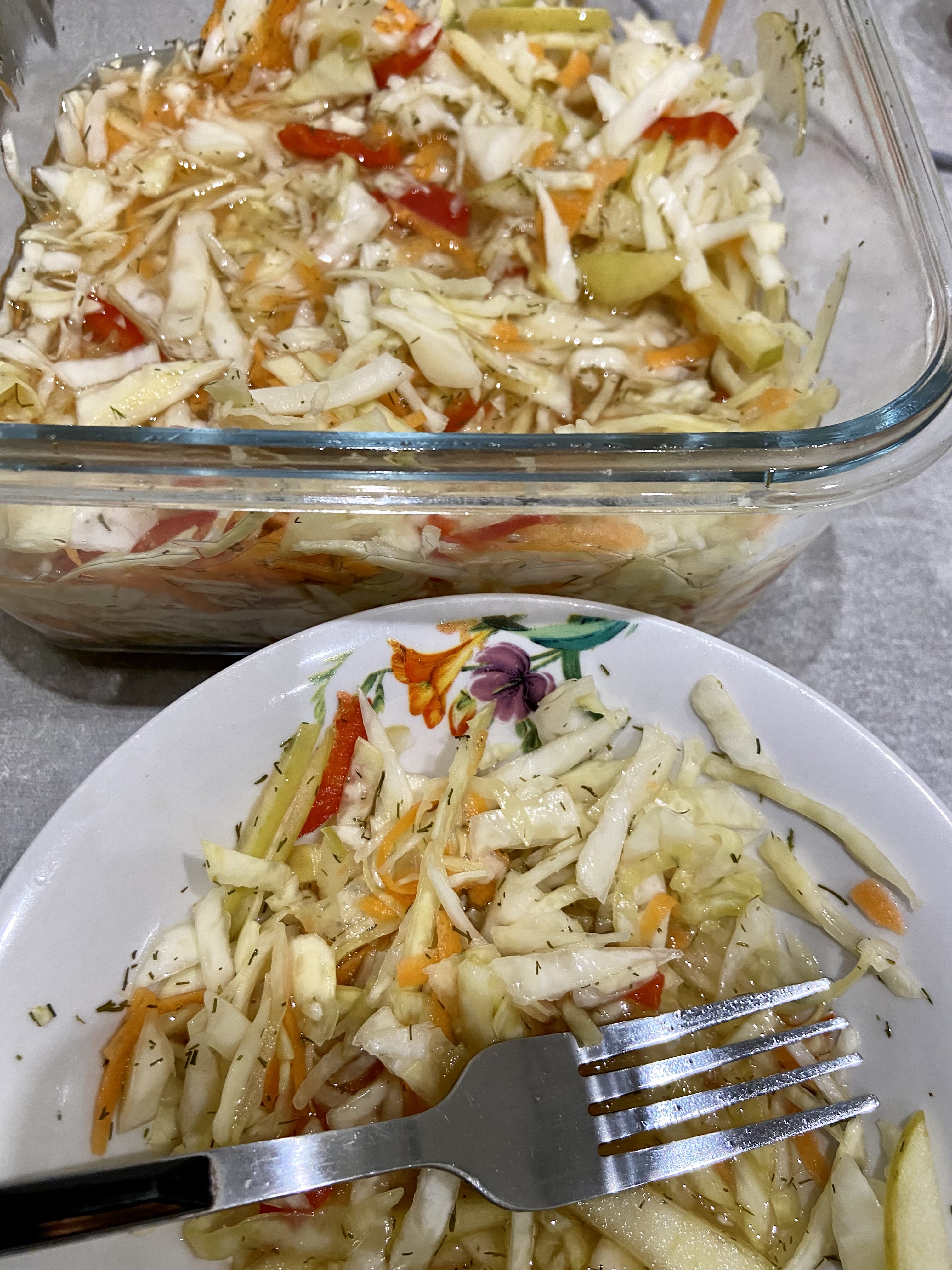 >>704808 Ну иногда сперва солят, потом мнут, потом ждут, чтобы сок дала, потом этот сок отжимают. Если делать с винигретной заправкой, так лучше промариновывается и остаётся хрустящей, но не прямо твёрдой. С майонезом или сметаной наверное без разницы.