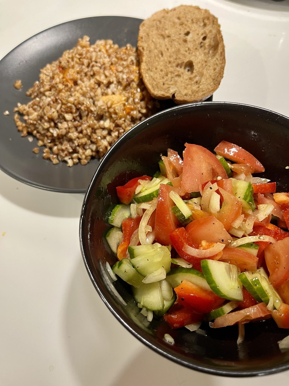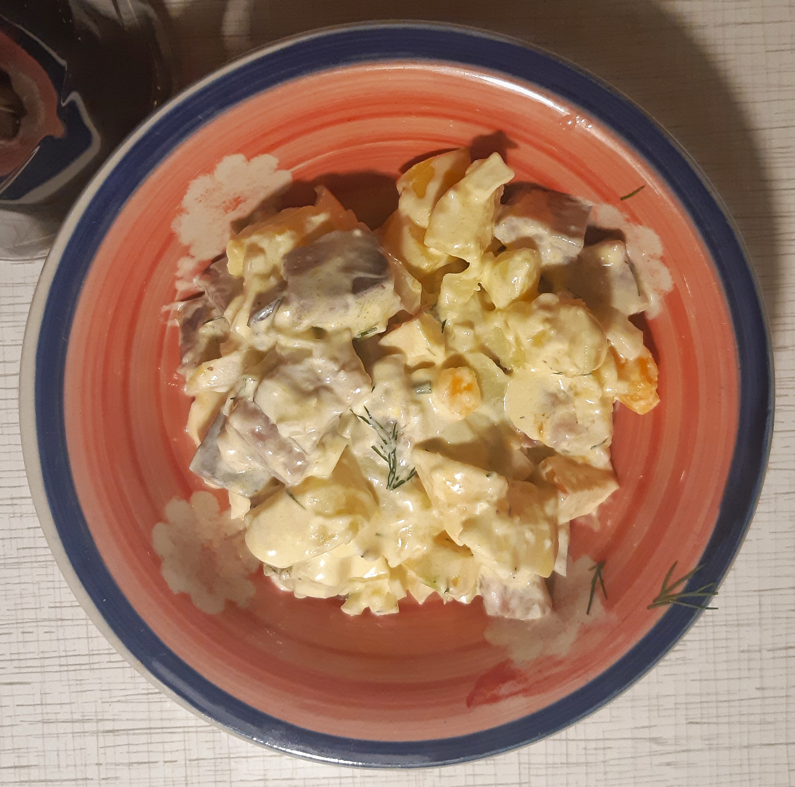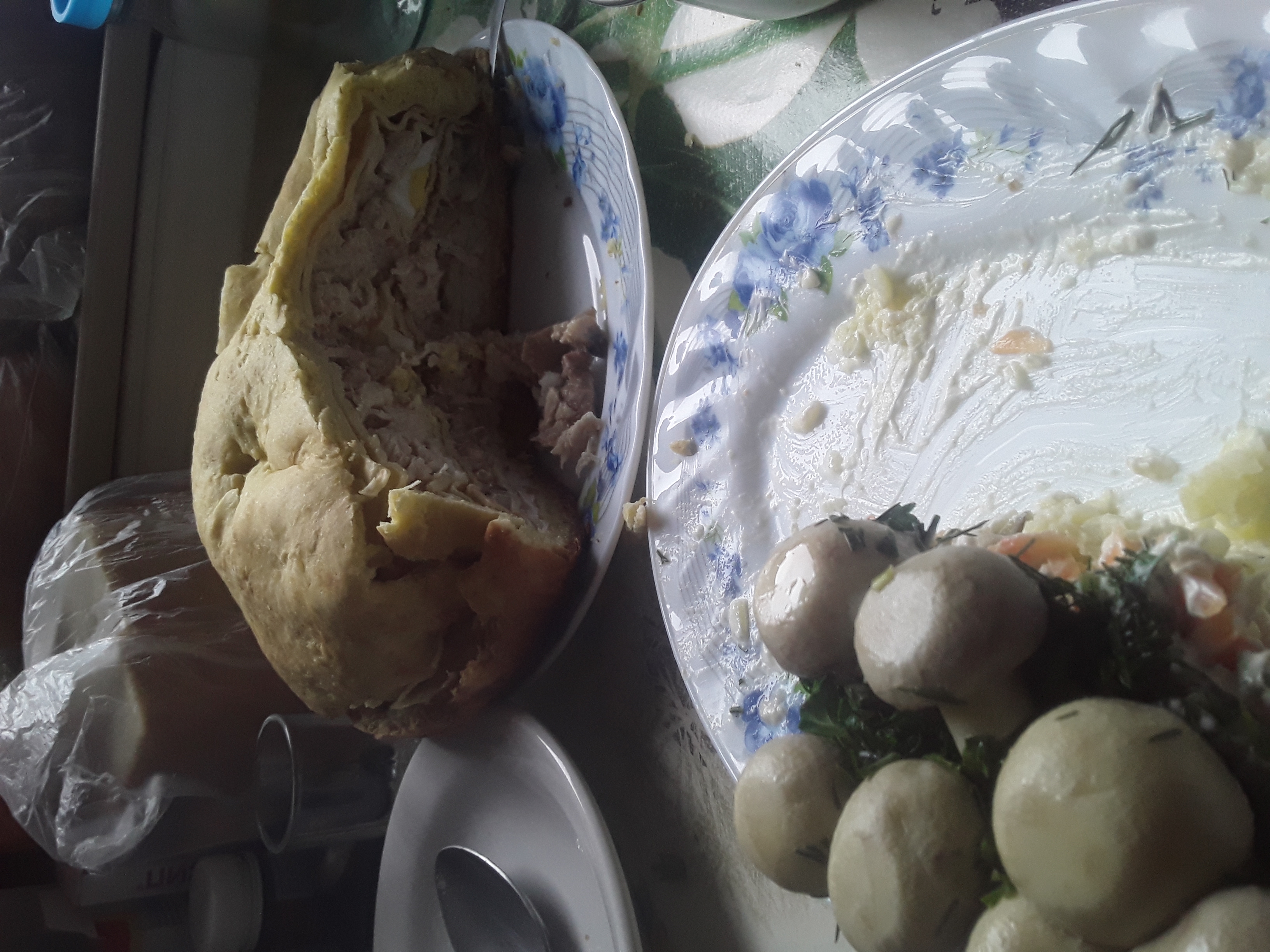 Сорян, что надкусанное, сразу не фоткал. На выходные к родителям ехал - салатик собрал и курник слепил (только яйца закончились, сверху помазать не хватило). Пирог норм получился, вроде, мама только сказала соды в тесте многовато.