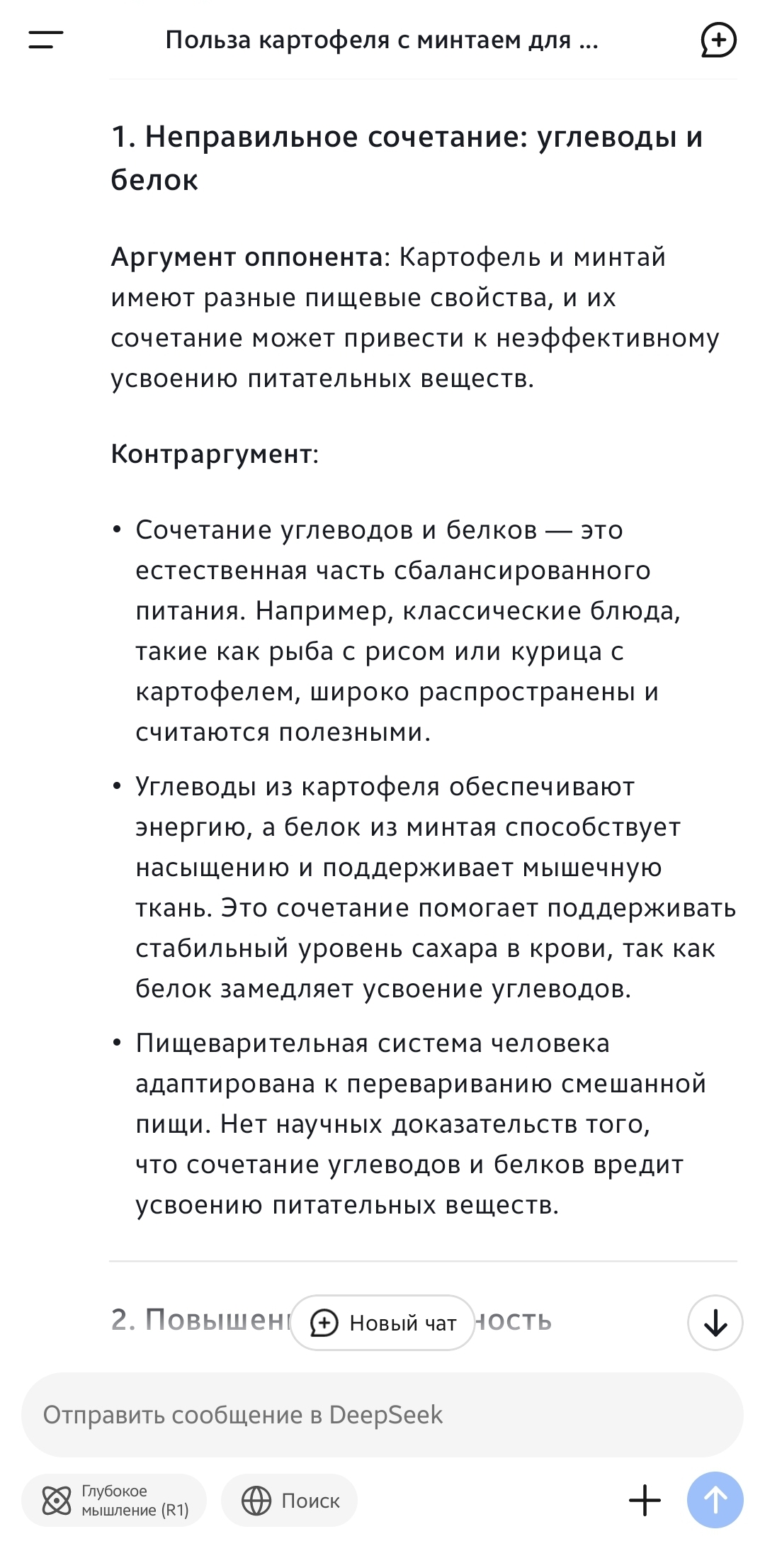 - Сочетание углеводов и белков — это естественная часть сбалансированного питания. Например, классические блюда, такие как рыба с рисом или курица с картофелем, широко распространены и считаются полезными. - Углеводы из картофеля обеспечивают энергию, а белок из минтая способствует насыщению и поддерживает мышечную ткань. Это сочетание помогает поддерживать стабильный уровень сахара в крови, так как белок замедляет усвоение углеводов. - Пищеварительная система человека адаптирована к перевариванию смешанной пищи. Нет научных доказательств того, что сочетание углеводов и белков вредит усвоению питательных веществ.