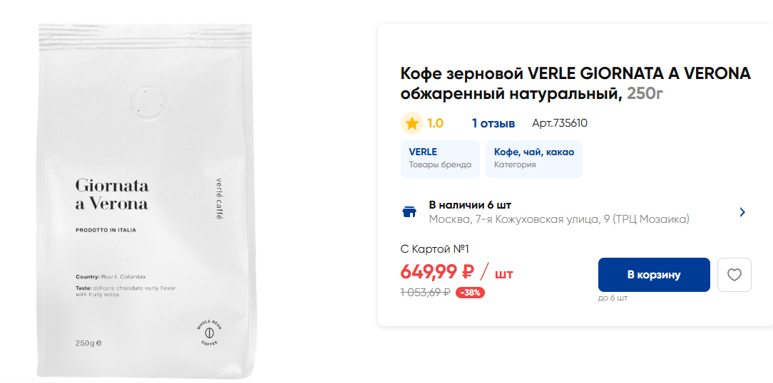 >>713321 Верле норм обжарщик, они и под своим брендом торгуют и кофейня максимально хипсторская у них есть. Такие коллабы часто максимальной годнотой получаются, крупный ритейлер заказываем ОЕМ продукт, за счёт массовости и их готовой цепочки продаж цена получается дешевле чем у самого производителя. Главное чтобы они его там свежеть не просрали, а то они могут все указанные по ГОСТу 12 месяцев его по складам гонять.